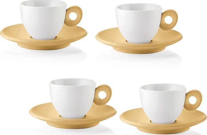 Zestaw 4 filiżanek do kawy ze spodkami charakteryzuje się porcelanowym korpusem o zaokrąglonym i otaczającym kształcie oraz dwukolorowym uchwytem i spodkiem MATERIAŁ NADAJĄCY SIĘ DO RECYKLINGU: Wykonany z wysokiej jakości białej porcelany i dwukolorowego plastikowego uchwytu WYMIARY: 12 x 24 x h6 cm (gift box) | 50 cc WYGODNY W CODZIENNYM UŻYCIU: Można go również używać w kuchence mikrofalowej ŁATWE W CZYSZCZENIU: Można myć w zmywarce