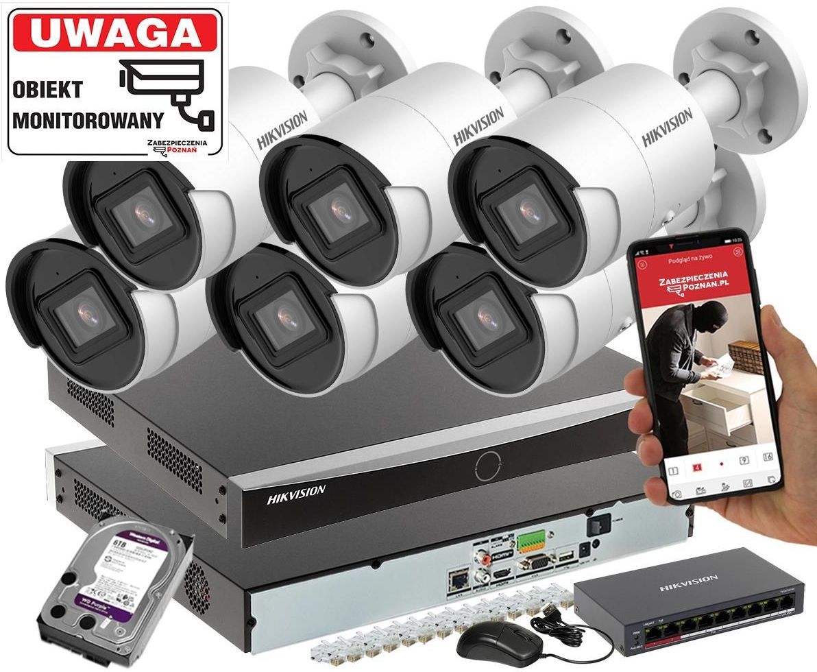 Zestaw monitoringu zawiera 6x Kamera IP Hikvision DS-2CD2083G2-LI2U 8 Mpx ACUSENSE, 1x Rejestrator IP Hikvision DS-7608NXI-K1 ACUSENSE na 8 kamer IP 12 Mpx, 1x Switch PoE Hikvision DS-3E0310P-E/M 8-PORTOWY, 1x Dysk do monitoringu HDD-WDPURZ 4TB 24/7 WESTERN DIGITAL, 14x wtyk RJ-45