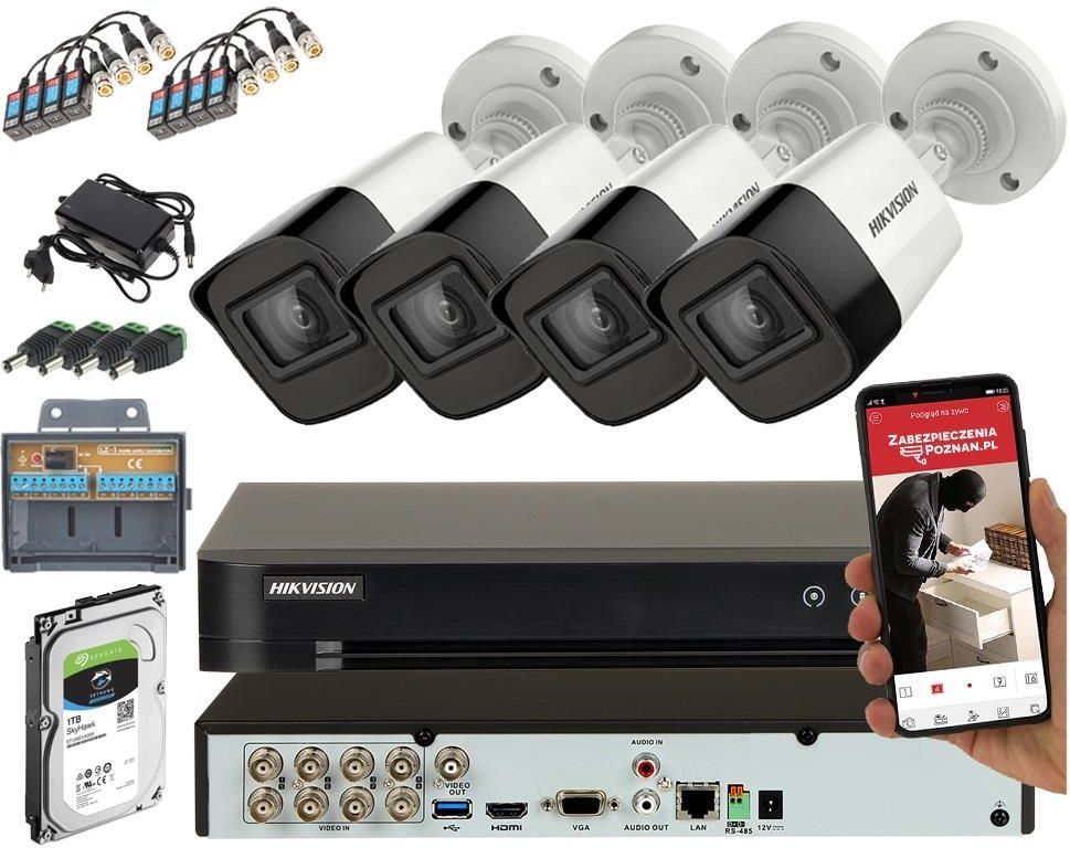 Zestaw monitoringu Hikvision zawiera: 4x Kamera tubowa Hikvision DS-2CE17H0T-IT3F(C) 2.8mm 5MPx TurboHD, 8-kanałowy rejestrator wielosystemowy Hikvision iDS-7208HUHI-M1/S TurboHD AcuSense, 1x Zasilacz do kamer + rozdzielacz zasilania, 8x Transformator video TR-1D-UHD 1x Dysk do monitoringu HDD-ST2000VX005 1TB SkyHawk SEAGATE (nagrywanie 24/7) Komplet złącz i wtyków do wyboru na przewód UTP lub koncentryczny.
