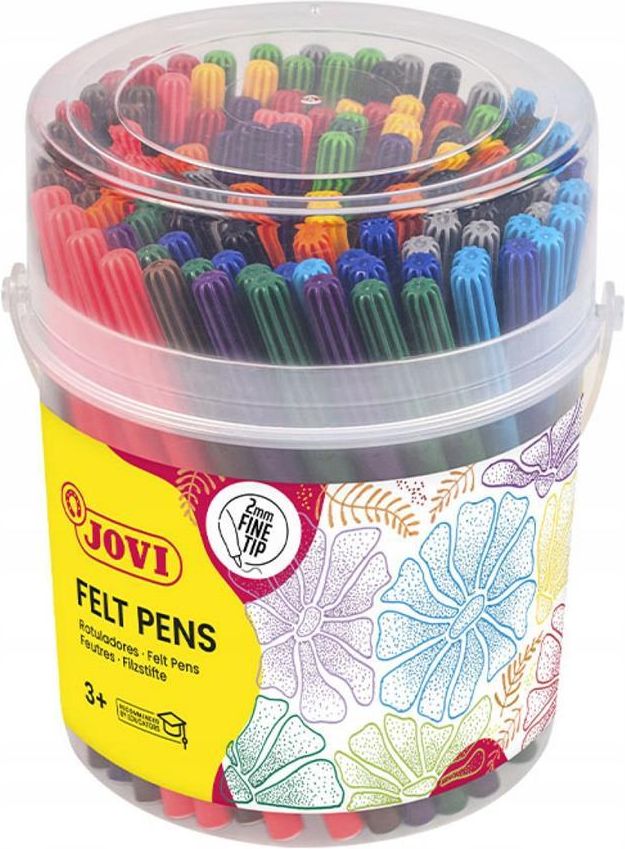 Flamastry dla dzieci w wiaderku - Jovi - 120 szt. Flamastry marki Jovi to połączenie intensywnych kolorów, trwałości i komfortu użytkowania – nic dziwnego, że trudno się im oprzeć! Są idealne do rysowania, kolorowania i tworzenia szczegółowych ilustracji, zachwycają równomiernym kryciem oraz płynnością pisania. Cienka końcówka o grubości 2 mm pozwala na precyzyjne prowadzenie linii, a solidna konstrukcja sprawia, że jest odporna na zgniatanie. Dodatkowo markery wyposażone są w bezpieczną, wentylowaną zatyczkę, co czyni je idealnym wyborem także dla dzieci. Żywe, nasycone kolory, trwała końcówka, bezpieczna konstrukcja i niezrównana precyzja – markery Jovi to idealny wybór dla wszystkich, którzy kochają kreatywność i wysoką jakość. OPAKOWANIE: 120 szt. (10 x 12 kolorów)