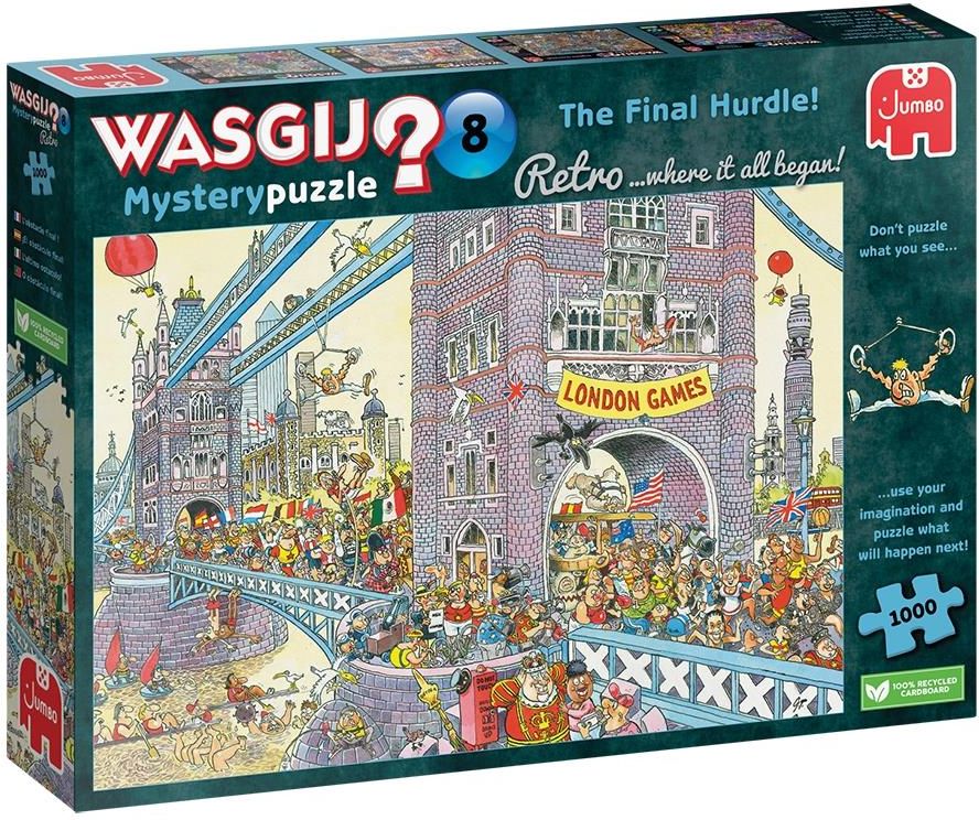 PUZZLE WASGIJ MYSTERY 1000 EL OSTATNI BIEG 00330 Wiek: 12+ Liczba elementów: 1000 WASGIJ to znakomita seria puzzli holenderskiej marki Jumbo, bijąca rekordy popularności i ciesząca się ogromnym uznaniem wśród puzzlomaniaków. Zamiast tradycyjnego układania obrazka widocznego na pudełku, Wasgij rzuca miłośnikom puzzli nie lada wyzwanie, bowiem obraz z pudełka jest jedynie wskazówką do rozwiązania rzeczywistej układanki! Każdy miłośnik układanek będzie się musiał nieźle nagłówkować i użyć wyobraźni, by odkryć, co skrywają puzzle Wasgij. Istnieją cztery serie główne w rodzinie puzzli Wasgij oraz dodatkowa seria Retro. Znacznie się od siebie różnią, ale łączy je jedna bardzo ważna cecha - obrazek na pudełku nigdy nie jest obrazkiem, który będziesz układać! Wasgij Original - postaw się na miejscu jednego z bohaterów układanki i odgadnij, co w danym momencie widzi - to właśnie obrazek, który będziesz musiał ułożyć. Dzięki temu do samego końca nie będziesz wiedział, jak wygląda w całości rozwiązana układanka! Wasgij Destiny - układanie tej serii to jak podróżowanie w czasie. Będziesz musiał użyć swojej wyobraźni, by odkryć (i ułożyć rzecz jasna), jak wyglądałaby scenka z obrazka oraz jej bohaterowie w dzisiejszych czasach. Wasgij Mystery - to seria dla mistrzów dedukcji. Spróbuj przewidzieć, jak potoczą się losy bohaterów obrazka na pudełku w ciągu najbliższych kilku minut i ułóż quot;rozwiązanie quot;. Wasgij Christmas - to świąteczna kolekcja puzzli Wasgij, w której podobnie jak w serii Wasgij Original będziesz musiał odgadnąć i ułożyć, co w danym momencie widzi jeden z bohaterów obrazka. Wasgij Retro - chciałbyś zobaczyć, jak to wszystko się zaczęło? Co sprawiło, że puzzle Wasgij zyskały tak ogromną popularność? Dzięki serii Retro będziesz mógł zmierzyć się z pierwszymi układankami z rodziny Wasgij, w nowej odświeżonej edycji. Prawdziwa gratka dla kolekcjonerów!