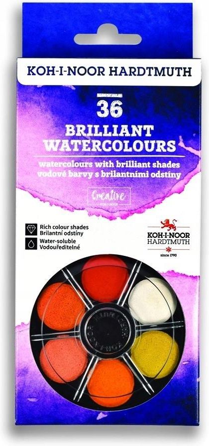 Farby akwarelowe umożliwiające uzyskanie specjalnych efektów artystycznych. Komplety farb w plastikowym, okrągłym opakowaniu zawierającym 36 kolory. Komplety zawierają pastylki o średnicy 22,5 mm. Kraj produkcji: CZ Producent: KOH-I-NOOR HARDTMUTH Trade a.s. Myslotínská 1429 393 16 Pelhřimov (CZ) tel: +420 565 301 220 email: kht@koh-i-noor.cz