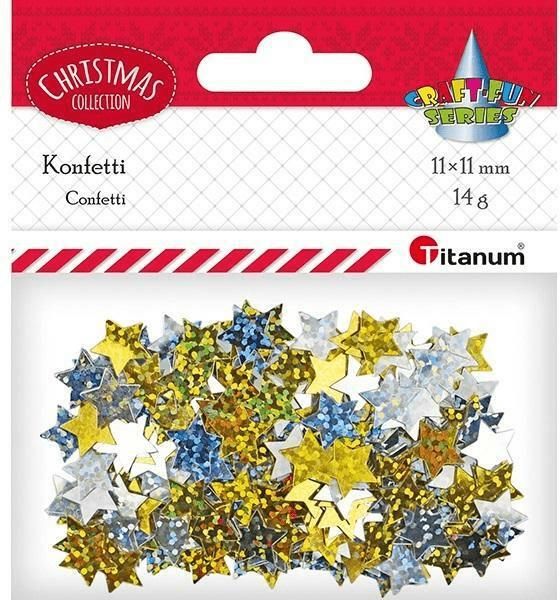Konfetti w formie Gwiazdek w odcieniach złota i srebra z efektem hologramu, 14g Ożyw swoje imprezy za pomocą kolorowych gwiazdek konfetti o wyjątkowym efekcie hologramu. Pakiet zawiera 14 gramów błyszczących, złotych i srebrnych konfetti w kształcie gwiazd, idealnych do dodania trochę blasku do każdego wydarzenia. Ta elegancka dekoracja doda kopa koloru i świeżości do twojej przestrzeni. Świętuj i baw się kolorowo z gwiazdkami konfetti od Titanum. EAN: 5903714531523