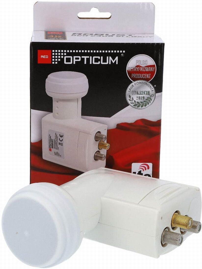 Konwerter satelitarny LNB Unicable Opticum Robust SCR 24UB + TRIPLE LegacyKonwerter UNICABLE przeznaczony do odbioru programów telewizji satelitarnej. Jedno wyjście konwertera SCR2 i jeden kabel dostarcza sygnał dla 24 odbiorników cyfrowych. Konwerter ma jednoprzewodową transmisję sygnału do dwudziestu czterech odbiorników z obsługą UNICABLE II (EN50494 + EN50607). Odbiorniki pracują w pełni niezależnie. Warunkiem jest posiadanie przez nich funkcji UNICABLE, która polega na wykorzystaniu do transmisji sygnału 24 częstotliwości: - Odbiornik 1 - 1210MHz - Odbiornik 2 - 1420MHz - Odbiornik 3 - 1680MHz - Odbiornik 4 - 2040MHz - Odbiornik 5 - 978MHz - Odbiornik 6 - 1028MHz - Odbiornik 7 - 1072MHz - Odbiornik 8 - 1116MHz - Odbiornik 9 - 1160MHz - Odbiornik 10 - 1271MHz - Odbiornik 11 - 1315MHz - Odbiornik 12 - 1359MHz - Odbiornik 13 - 1484MHz - Odbiornik 14 - 1528MHz - Odbiornik 15 - 1572MHz - Odbiornik 16 - 1616MHz - Odbiornik 17 - 2084MHz - Odbiornik 18 - 2128MHz - Odbiornik 19 - 1816MHz - Odbiornik 20 - 1860MHz - Odbiornik 21 - 1904MHz - Odbiornik 22 - 1948MHz - Odbiornik 23 - 1992MHz - Odbiornik 24 - 1728MHzJedno wyjście konwertera UNICABLE (SCR) w kolorze złotym pozwala na poprowadzenie sygnału jednym kablem do max. 24 odbiorników cyfrowych z sygnałem SCR lub UNICABLE. Trzy wyjścia konwertera full band w kolorze srebrnym pozwalają na podłączenie trzech tradycyjnych odbiorników cyfrowych. Parametry techniczne: - Pasmo wejściowe: 10,70-11,70 GHz/11,70- 12,75 GHz - Pasmo wyjściowe: 950-1950 MHz/1100-2150 MHz - Górne pasmo wejściowe; 11,7-12,75 GHz - Oscylator górny: 10,4/9,75/10,6 GHz - Wyjścia kanałów SCR: 24 - Wyjścia sygnałów Full Band: 3 - Wzmocnienie: pow. 57 dB - Ilość wyjść full band: 2 - Współczynnik szumów: 0,1 dB - Pobór prądu: 300 mA - Średnica uchwytu: 40 mm - Temperatura pracy: - 40˚C + 65˚C
