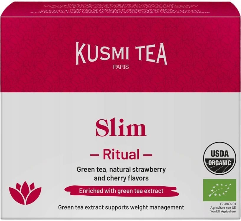 Wyszczuplająca zielona herbata, mate o aromacie wiśni i truskawki. Osiągnij swoje cele dzięki wyszczuplającemu rytuałowi: owocowej mieszance mate i organicznej zielonej herbaty o klinicznie potwierdzonych korzyściach! Herbata sypana stworzona przez markę Kusmi Tea. Mnóstwo naturalnych składników, ogrom smaku i moc aromatu! Wyszczuplająca zielona herbata, mate o aromacie wiśni i truskawki. Osiągnij swoje cele dzięki wyszczuplającemu rytuałowi: owocowej mieszance mate i organicznej zielonej herbaty o klinicznie potwierdzonych korzyściach! Odkryj Slim Ritual. Kusmi Tea nieustannie wprowadza innowacje, łącząc naturalność i skuteczność w tej odchudzającej herbacie. Jej cel ? Pomoże Ci kontrolować swoją wagę, delektując się codziennie tą pyszną mieszanką zielonej i mate herbaty z naturalnymi aromatami czerwonych owoców.Jej sekret? Zielona herbata, naturalnie bogata w EGCG, substancję czynną znaną ze swojego wpływu na utlenianie tłuszczów. Dzięki innowacyjnemu procesowi naukowemu nasza herbatka odchudzająca została wzbogacona ekstraktem z zielonej herbaty, który skupia jej zalety i zapewnia odpowiednią dawkę aktywnego składnika .Obecnie 38% światowej populacji cierpi na nadwagę związaną z brakiem równowagi pomiędzy kaloriami spożywanymi i wydatkowanymi. W 80% przypadków, dieta powoduje powrót do wagi w następnym roku. Dzięki wyszczuplającemu Rytuałowi herbata Kusmi stanowi naturalne i skuteczne rozwiązanie stymulujące metabolizm i spalanie kalorii, delektując się filiżanką dobrej herbaty. Idealny partner do włączenia się w codzienną rutynę. Polecamy włączenie naszej herbaty odchudzającej do zdrowego trybu życia z regularną aktywnością fizyczną. Najważniejsze to czuć się dobrze w ciele i dobrze w umyśle! Aby osiągnąć zamierzone cele, zalecamy spożywanie 3 filiżanek tej odchudzającej herbaty dziennie przez minimum trzy miesiące.Sposób parzenia: Temperatura wody: 80°C Czas: 3 - 4 minuty Składniki: Zielona herbata* i ekstrakt z zielonej herbaty* (94%), mate*, naturalne aromaty wiśni i truskawek, substancja glazurująca: karagen pochodzenia roślinnego; białko grochu.