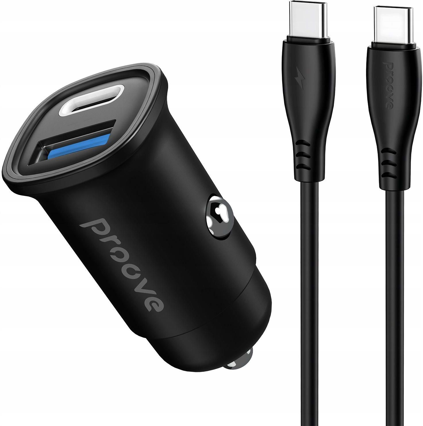 Ładowarka samochodowa Flash 30W USB-C + USB-A W zestawie kabel USB-C na USB-C Moc do 30 W – ładowanie smartfonów, tabletów i innych urządzeń mobilnych. Dwa porty wyjściowe – USB-C i USB-A, możliwość ładowania dwóch urządzeń jednocześnie. Uniwersalne zastosowanie – działa w gniazdach 12V i 24V, pasuje do wszystkich pojazdów z zapalniczką samochodową. Bezpieczeństwo – wbudowane zabezpieczenia chronią przed przegrzaniem, przepięciem i zwarciem. W zestawie kabel USB-C na USB-C (1 m) – ładowarka gotowa do użycia od razu po wyjęciu z pudełka. Produkt firmy: Proove Model: CCFC30111202 / FLASH Kolor: Czarny Szukasz niezawodnej i kompaktowej ładowarki samochodowej, która zapewni szybkie ładowanie Twoich urządzeń w podróży? Flash 30W to idealne rozwiązanie! Dzięki obsłudze szybkiego ładowania QC 3.0 oraz mocy do 30 W, naładujesz swój smartfon, tablet, nawigację czy inne urządzenia w błyskawicznym tempie – nawet podczas krótkiej trasy. W zestawie znajdziesz elastyczny kabel USB-C → USB-C o długości 1 m, wykonany z miękkiego i wytrzymałego silikonu, który zapewnia komfort użytkowania i długą żywotność. Specyfikacja techniczna Materiał obudowy: ABS (trwały, odporny na uszkodzenia) Maksymalna moc: 30 W Protokoły szybkiego ładowania: QC 3.0 Porty wyjściowe: 1x USB-C / USB TYPE-C, 1x USB / USB-A Moc wyjściowa USB-C: DC 5V/3A, 9V/2A, 12V/2.5A (PPS 3.3-11V/3A) (30W max) Moc wyjściowa USB-A: DC 5V/3A, 9V/2A, 12V/1.5A (18W max) Ładowanie równoczesne (USB-C + USB-A): 15W + 15W Wejście: DC 12/24V (uniwersalne do samochodów osobowych i ciężarowych) Waga: 12,8 g Wymiary: 22.6 × 22.6 × 44 mm Kabel w zestawie Typ: USB-C → USB-C Długość: 1 m Materiał: miękki silikon (elastyczny i trwały) Obsługiwana moc: do 20V/3A Produkt fabrycznie nowy, w oryginalnym opakowaniu. Kod produktu (SBkod): SB10607