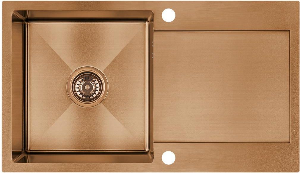 Laveo Marmara Sam 811T Miedziany Zanurz się w wyjątkowy świat nowoczesnych i eleganckich kuchni dzięki Laveo Marmara Sam 811T Miedziany. Ten zlewozmywak to nie tylko praktyczne narzędzie, które ułatwi codzienne czynności, ale także designerski element, który wzbogaci estetykę Twojej kuchni. Wysokiej jakości stal nierdzewna w miedzianym wykończeniu, a także innowacyjne rozwiązania techniczne sprawiają, że ten model wyróżnia się na tle konkurencji. Praktyczność i funkcjonalność Zlewozmywak jednokomorowy o wymiarach 76 cm x 44 cm to idealne rozwiązanie dla małych i średnich kuchni. Głębokość komory wynosząca 19 cm umożliwia wygodne mycie dużych naczyń i garnków. Wyposażony w ociekacz, który umożliwia swobodne suszenie naczyń, a także dodatkową powłokę ułatwiającą odprowadzanie wody, co gwarantuje efektywność i komfort użytkowania. Montaż i estetyka Zlewozmywak Marmara można zamontować jako wpuszczany w blat lub na równi z blatem, co zapewnia elastyczność w aranżacji kuchni. Jego płaskie wykończenie krawędzi ułatwia utrzymanie go w czystości, a niemalże równa powierzchnia z blatem minimalizuje gromadzenie się zanieczyszczeń. Dodatkowo, model ten wyposażony jest w fabrycznie wycięte otwory pod baterię, co ułatwia instalację. Trwałość i jakość wykonania Zlewozmywak Laveo Marmara wykonany jest z wysokiej jakości stali 304, która zapewnia zarówno estetyczny wygląd, jak i trwałość. Materiał ten jest odporny na zarysowania, przebarwienia oraz uszkodzenia mechaniczne, co sprawia, że produkt będzie zachowywał świeży wygląd przez długie lata. Dodatkowo jest odporny na temperaturę do 250°C oraz szok termiczny. Dodatkowe funkcje i zalety Zlewozmywak Marmara oferuje szereg dodatkowych funkcji: wysokiej jakości stal o grubości 1 mm (górny kołnierz 3 mm), przyłącze do zmywarki dla zwiększenia funkcjonalności, odwracalność umożliwiająca montaż zgodnie z preferencjami użytkownika, manualny korek utrzymujący spójność estetyczną z resztą zestawu, wygłuszona komora zwiększająca komfort użytkowania. Podsumowanie Laveo Marmara Sam 811T Miedziany to idealne połączenie wyjątkowej estetyki, funkcjonalności i trwałości. Dzięki wysokiej jakości materiałom oraz przemyślanym rozwiązaniom technicznym jest to produkt, który spełni oczekiwania nawet najbardziej wymagających użytkowników. Niezależnie od wielkości Twojej kuchni, ten zlewozmywak stanie się jej nieodłącznym elementem, ułatwiając codzienne czynności i dodając jej elegancji.