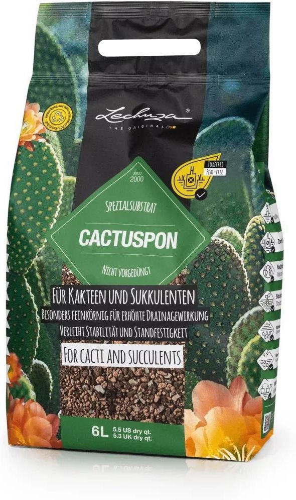 Podłoże roślinne CACTUSPON 6 litrów Lechuza Twoi kłujący współlokatorzy poczują się całkowicie swobodnie! Kaktusy i sukulenty pochodzą z suchych regionów i wymagają podłoża o zwiększonym działaniu drenażowym, aby zapobiec tworzeniu się zbiorników wodnych. Czysto mineralne podłoże roślinne CACTUSPON …
