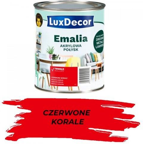 Przedmiotem aukcji sklepu "KLEKS NA ŚCIANIE" jest: LUXDECOR EMALIA AKRYLOWA CZERWONE KORALE POŁYSK 0,75L Emalia akrylowa jest uniwersalną wodorozcieńczalną emalią akrylową do malowania drewna, materiałów drewnopodobnych, gipsu i betonu. Wydajność: do 14 m²/l wydajność zależy od rodzaju i …