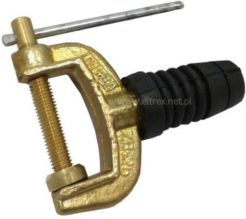 Zacisk masowy biegunowy śrubowy | ZBS 25 | 1 szt. Zacisk masowy ZBS 25 Zacisk biegunowy składa się z mosiężnej obejmy, śruby z przetyczką oraz gumowej osłony w miejscu mocowania przewodu spawalniczego. Przewód spawalniczy jest mocowany przy pomocy wkręta specjalnego. Dokręcanie śruby powoduje prawidłowy kontakt elektryczny przewodu spawalniczego ze spawanym materiałem. Wykonanie zacisku z mosiądzu zapewnia właściwą trwałość eksploatacyjną. ZASTOSOWANIE Zacisk biegunowy służy do pewnego i szybkiego mocowania przewodu spawalniczego typu OS lub OS2 (kat. SWW 1123 lub równorzędnego), jako jednego z biegunów spawarki (prostownika spawalniczego) do materiału spawanego lub stołu spawalniczego. W skład kompletu zacisku spawalniczego wchodzi Zacisk biegunowy Blaszka miedziana Torebka polietylenowa 0,05x150x150 mm Ulotka z przepisami obsługi Kompletny gotowy do montażu. Cena dotyczy 1 sztuki.