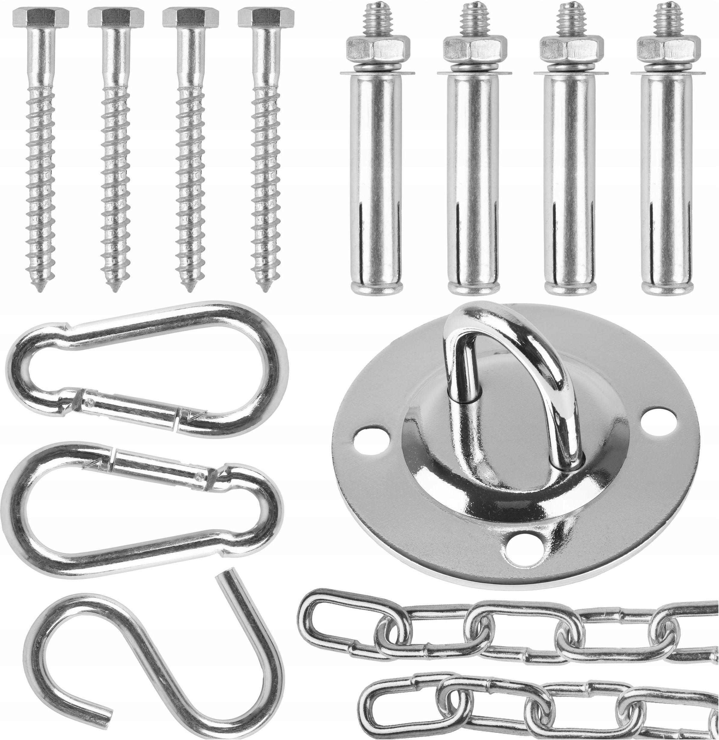 ZESTAW MONTAŻOWY DO FOTELI WISZĄCYCH KRZESEŁ BRAZYLIJSKICH Najważniejsze cechy produktu Kompletny Zestaw: Zawiera wszystkie potrzebne elementy, w tym łańcuch, karabinki, śruby, kołki, hak sufitowy oraz uchwyt w kształcie litery 'S'. Wysoka Jakość: Elementy wykonane z trwałych i wytrzymałych materiałów, zapewniają długotrwałe użytkowanie i odporność na uszkodzenia. Bezpieczeństwo: Solidne śruby, kołki oraz hak sufitowy gwarantują stabilne i bezpieczne zamocowanie fotela wiszącego, minimalizując ryzyko wypadku. Uniwersalność: Zestaw jest kompatybilny z różnymi modelami foteli wiszących, co sprawia, że jest wszechstronny i praktyczny. Zawartość Zestawu 1x Łańcuch o długości 1,5 m 2x Karabinek 4x Śruby do drewna 4x Kołki do muru 1x Okrągły hak sufitowy 1x Uchwyt/Hak 'S' Dlaczego warto wybrać nasz produkt? Nasz zestaw montażowy do foteli wiszących to idealne rozwiązanie dla osób, które cenią sobie bezpieczeństwo i stabilność podczas relaksu w fotelu wiszącym. Dzięki wysokiej jakości wykonania i kompletnemu wyposażeniu, nasz produkt spełni oczekiwania nawet najbardziej wymagających użytkowników. Trwałość i Wytrzymałość: Wysokiej jakości materiały zapewniają długotrwałe użytkowanie i odporność na uszkodzenia. Bezpieczeństwo: Solidne mocowania gwarantują bezpieczne użytkowanie foteli wiszących. Łatwość Użytkowania: Kompletny zestaw umożliwia szybki i prosty montaż fotela wiszącego, bez potrzeby dodatkowych narzędzi.