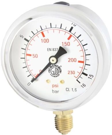 Uniwersalny manometr glicerynowy do użytku przemysłowego. Dzięki zastosowaniu gliceryny manometr może być wykorzystywany do urządzeń generujących znaczne drgania. Gliceryna zapobiega drganiu wskazówki i zapewnia precyzyjny odczyt. DANE TECHNICZNE: Zakres pomiaru [bar] 0-16 Tarcza [mm] 63 Przyłącze [cal] 1/4" dolne Element roboczy rurka Bourdona UWAGA. Manometry w zależności od dostawy mogą być różnych producentów: ITALMANOMETRI lub HPA.
