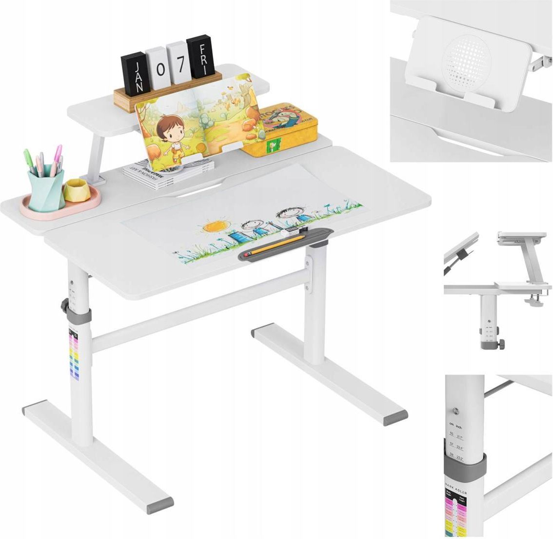 Ergonomiczne biurko Study 3.7 Grey – rośnie razem z Twoim dzieckiem! Funkcjonalne, bezpieczne i wygodne – zapewnia idealne warunki do nauki, zabawy i rozwijania pasji każdego dnia. Płynna regulacja wysokości od 55 do 75 cm – dopasowanie do wzrostu dziecka od 90 do 160 cm Możliwość pochylenia blatu aż do 40° – idealne warunki do rysowania, pisania i czytania Antyrefleksyjna powłoka blatu – chroni wzrok i redukuje odbicia światła Cechy szczególne Biurko regulowane dla dzieci Dopasowane do wzrostu dziecka –dla dzieci od 90 do 160 cm wzrostu Regulacja wysokości blatu –płynna regulacja od 55 do 75 cm Praktyczna miarka wysokości – szybkie i precyzyjne ustawienie wysokości blatu Wysuwana podstawka na książki – wspiera wygodną naukę Dodatkowa półka na przybory – ułatwia organizację Blat z powłoką antyrefleksyjną – redukuje odbicia światła i chroni wzrok dziecka Możliwość pochylenia blatu – regulacja nachylenia do 40° Zaokrąglone rogi - bezpieczna konstrukcja Możliwość pochylenia blatu do 40 Regulowany kąt nachylenia pozwala dopasować blat do aktywności dziecka. Zapewnia ergonomiczne warunki do pisania, rysowania, czytania i prac plastycznych. Wspiera prawidłową postawę i minimalizuje napięcie karku oraz pleców. Blokada przy krawędzi blatu – chroni przed zsuwaniem się książek i przyborów. Biurko regulowane dla dzieci Regulacja wysokości blatu w zakresie 55 – 75 cm – idealne dopasowanie do wzrostu dziecka. Praktyczna miarka wysokości – czytelna skala na nodze biurka pozwala na szybkie i precyzyjne ustawienie blatu. Blat z powłoką antyrefleksyjną Specjalna powłoka antyrefleksyjna redukuje odbicia światła. Chroni wzrok i zmniejsza zmęczenie oczu podczas długiej nauki lub zabawy. Podstawka na książki Wysuwana podstawka na książki – zapewnia komfort podczas nauki i ułatwia utrzymanie porządku na blacie. Bezpieczna konstrukcja Zaokrąglone rogi blatu – chronią przed uderzeniami i skaleczeniami. Udźwig biurka do 75 kg – trwałość i stabilność na lata. Maksymalne obciążenie półki: 25 kg – idealna na książki, zeszyty czy przybory szkolne. Specyfikacja Producent: Mark Adler Model: Study 3.7 Grey Materiał: MDF, stal, PP Regulacja wysokości blatu: 55 do 75 cm Mechanizm regulacji wysokości: ręczne podnoszenie Certyfikat: REACH