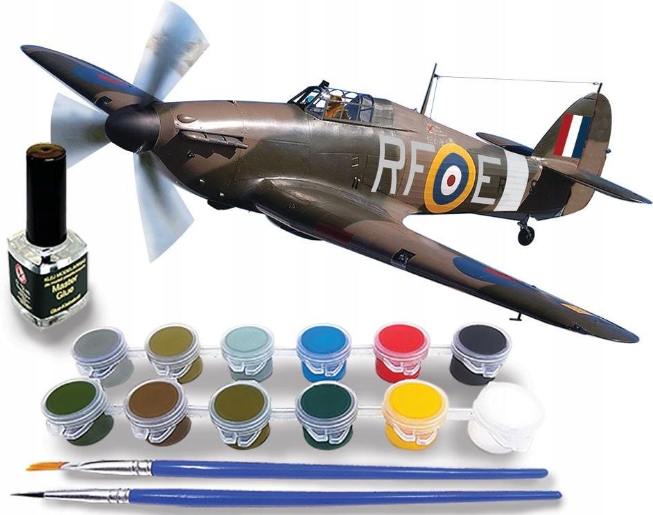 Zestaw do sklejania HURRICANE Mk.Ia 'Battle of Britain' z farbami i klejem 'Bitwa o Anglię Dywizjon 303' model plastikowy nowy, oryginalnie zapakowany w skali 1:72 kalkomanie (naklejki) klej modelarski Master Glue z pędzelkiem 12 ml zestaw 12 farb akrylowych (wodorozcieńczalnych) 2 pędzelki …