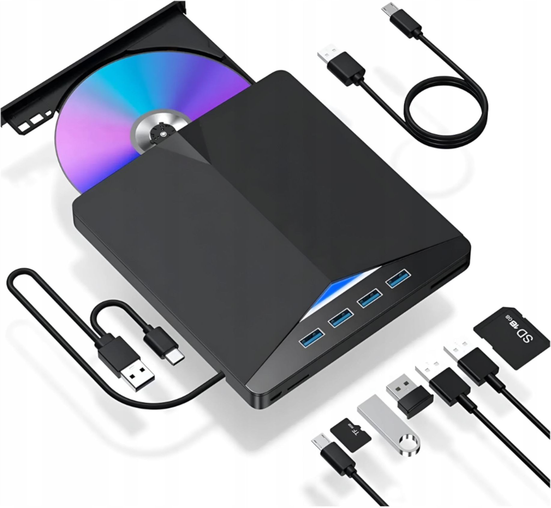 Zewnętrzna nagrywarka CD/DVD 7w1 USB 3.0x4 Czytnik kart SD/TF HUB USB Odkryj wielofunkcyjną zewnętrzną nagrywarkę CD/DVD 7w1, która nie tylko zapisuje i odtwarza płyty, ale także oferuje cztery porty USB 3.0 oraz czytnik kart SD/TF, zapewniając wszechstronność i wygodę w jednym urządzeniu. Idealna do pracy i rozrywki, umożliwia szybki transfer danych i rozbudowę możliwości Twojego komputera. ⭐ Plug and Play - nie wymaga dodatkowego zasilania, ani sterowników. Podłączasz urządzenie po kablu i wszystko już jest gotowe do pracy! ⭐ Odczyt formatów: DVD CD VCD - najpopularniejsze formaty płyt. ⭐ 4 złącza USB 3.0 - zapewnią pracę na wielu urządzeniach jednocześnie. Główne funkcje ✅ Odtwarzacz DVD/CD z funkcją nagrywania, ✅ Rejestrator DVD/CD, umożliwia zgrywanie wszystkich zdjęć, filmów czy programów które posiadasz, z zawrotną prędkością, ✅ 4-portowy HUB USB 3.0, dzięki któremu podłączysz wiele urządzeń naraz do stacji, wszystko dostosowane pod Twoje preferencje. ✅ Czytnik kart SD/TF, czytnik kart SD umożliwi odczyt danych takich jak zdjęcia, filmy czy gry, ✅ Napęd na USB 2.0/3.0 oraz USB-C - napęd posiada wtyk zarówno USB 2.0/3.0 jak i USB-C dzięki czemu podłączysz go do wszystkiego czego potrzebujesz. Również do komputerów firmy Apple, bez zbędnych przejściówek! Kompaktowy rozmiar Urządzenie dzięki swojej minimalistycznej formie, bezproblemowo zapakujemy do torby czy plecaka, dzięki czemu świetnie sprawdzi się w podróży. Jego niewielka waga dodatkowo sprawi, że będzie praktycznie nieodczuwalny podczas noszenia. Możesz zabrać je ze sobą na każdą wyprawę, ciesząc się ulubionymi funkcjami bez zbędnego obciążenia. Dzięki temu zyskasz więcej miejsca na inne potrzebne przedmioty i zwiększysz komfort swoich podróży. Wymiary: 14,5x15,5x1,5cm Waga: 0,3kg Specyfikacja techniczna Pojemność pamięci podręcznej: 2MB Typ interfejsu: USB 3.0 Metoda ładowania płyty: typ tacy Odczyt formatu płyty: DVD CD VCD Prędkość odczytu: DVD 8X CD/VCD 24X Prędkość zapisu: DVD 8X CD/VCD 24X Rozmiar: 14.5*15.5*1.5CM Obsługiwane standardy dysków: DVD-RW Maksymalna prędkość spalania DVD: 8X Format nagrywania: DVD-RW Kompatybilność Odtwarzacz współpracuje z komputerami osobistymi i laptopami z systemami: Windows 11, 10, 7, Vista, XP, Linux, Mac OS. Odtwarzacz NIE współpracuję z telewizorami, samochodami, smartphonami, tabletami i chromebookami. Zestaw zawiera Napęd DVD/CD 7w1 - pozwala na odtwarzanie i nagrywanie różnych formatów dysków, zapewniając wszechstronność użytkowania. Kabel USB 3.0 - umożliwia szybki transfer danych, oszczędzając Twój czas podczas przesyłania plików. Wbudowany kabel USB Combo z USB-C - zapewnia kompatybilność z najnowszymi urządzeniami, eliminując potrzebę dodatkowych adapterów. Opakowanie - solidne i estetyczne, gwarantuje bezpieczny transport i przechowywanie sprzętu. Instrukcja. FAQ P: Czy napęd jest kompatybilny z laptopami? O: Tak, napęd jest w pełni kompatybilny z laptopami wyposażonymi w port USB. P: Jakie formaty płyt obsługuje napęd? O: Napęd obsługuje płyty CD-R, CD-RW, DVD-R, DVD+R, DVD-RW, DVD+RW i DVD-RAM. P: Czy napęd współpracuje z systemem Mac OS? O: Tak, napęd jest kompatybilny z systemem Mac OS, a także z Windows i Linux. P: Czy napęd wymaga zasilania zewnętrznego? O: Nie, napęd zasilany jest poprzez port USB i nie wymaga dodatkowego zasilania.