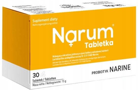 30 tabletek zawierających oryginalny szczep Lactobacillus acidophilus ER-2 317/402 Narine produkowany w Armenii, służący do utrzymania składu i aktywności biologicznej normalnej mikroflory jelitowej u dzieci i dorosłych. Skład Lactobacillus acidophilus ER-2 szczep 317/402 Narine Zawartość Lactobacillus acidophilus ER-2 szczep 317/402 Narine w zależności od dawki: 1 tabletka: 1,5×10¹¹ CFU/g 2 tabletki: 3×10¹¹ CFU/g 3 tabletki: 4,5×10¹¹ CFU/g 6 tabletek: 9×10¹¹ CFU/g 7 tabletek: 10,5×10¹¹ CFU/g 8 tabletek: 12×10¹¹ CFU/g 9 tabletek: 13,5×10¹¹ CFU/g CFU (Colony Forming Unit) - jednostka tworząca kolonię bakterii Sposób użycia Dawkowanie: Dawkowanie ustala się indywidualnie w zależności od potrzeb. Tabletki należy przyjmować 15-20 minut przed posiłkami z ½ szklanki napoju o temperaturze pokojowej. Najlepiej przyjmować z mlekiem (poza przypadkami nietolerancji produktów mlecznych). Nie należy przekraczać zalecanej porcji do spożycia w ciągu dnia. Przeciwwskazania Nadwrażliwość na składniki produktu Kobiety w ciąży i karmiące powinny spożywać preparat wyłącznie po konsultacji z lekarzem Ostrzeżenia Suplement diety nie może być stosowany jako substytut zróżnicowanej diety Nie należy stosować po upływie terminu ważności podanego na opakowaniu Przechowywanie Przechowywać w chłodnym miejscu w temperaturze nie wyższej niż +10°C. Trzymać w sposób niedostępny dla dzieci. Tylko na czas transportu może być przechowywany w temperaturze pokojowej. Informacje dodatkowe Zawartość: 30 tabletek po 500 mg Masa netto: 15 g Postać: Tabletki Producent NARUM Sp. z o.o. ul. Świeradowska 47 02-662 Warszawa, Polska Suplement diety nie może być stosowany jako substytut zróżnicowanej diety. Zrównoważony sposób żywienia i zdrowy tryb życia są kluczowe dla zachowania zdrowia.
