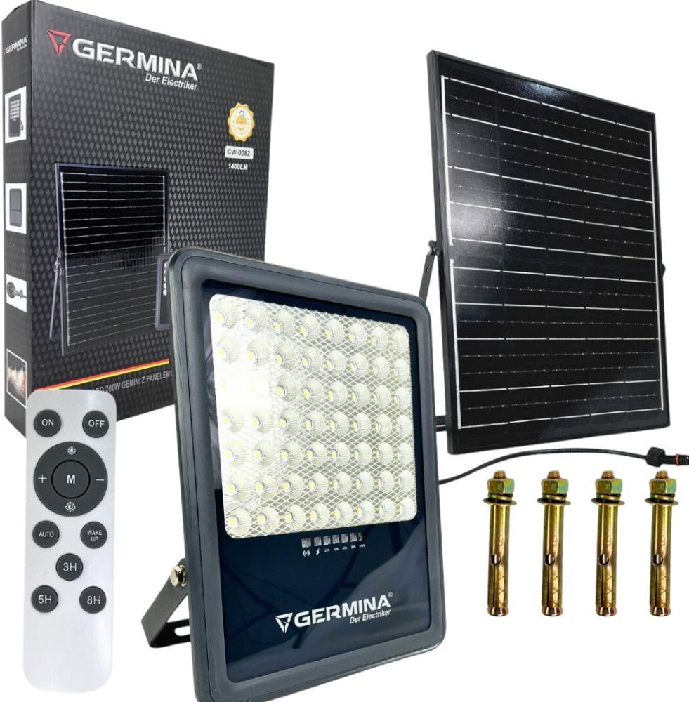 Naświetlacz LED 200W mała fotowoltaika lampa solarna z pilotem twoje własne źródło enegrii ______________________________________ !!! NAJNOWSZA TECHNOLOGIA PANELU LED !!! = MAKSYMALNIE WYKORZYSTUJE ENERGIĘ SŁONECZNĄ ✅ Samowystarczalny naświetlacz nie potrzebuje podłączenia do sieci, by świecić ! Ten naświetlacz mała fotowoltaika lampa solarna w ciągu dnia panel solarny ładuje się automatycznie i zapala się po zmroku. Zapewnij sobie oświetlenie przez cały rok bez rachunku za prąd. ☀️ Energia jest przechowywana w akumulatorze, który jest wbudowany w obudowę naświetlacza♻️ Używając tego produktu, można całkowicie uniezależnić się od problemów związanych z ewentualnymi przerwami w dostawie prądu w domu lub na wsi, ponieważ akumulator jest ładowany w ciągu dnia, po czym reflektor może pracować autonomicznie nawet przez 12 godzin.❕ Reflektor jest zabezpieczony przed wpływem czynników środowiskowych, takich jak deszcz, śnieg, brud i uszkodzenia mechaniczne.❗️ Obudowa naświetlacza wykonana jest ze stopu aluminium, pokrytego specjalną chropowatą warstwą, która jest trudna do zarysowania lub uszkodzenia.✔️ Szeroki zakres temperatur pracy nie ogranicza użytkownika w użytkowaniu systemu o każdej porze roku. ❗️Kabel ma długość 1 metra. Styki kabla są pokryte cienką warstwą złota technicznego, co zapobiega ich utlenianiu przez długi czas i pozwala zachować sprawność przesyłu energii. ✅ Za pomocą dołączonego pilota zdalnego sterowania można regulować jasność i ustawiać różne tryby pracy w małej fotowoltaice lampie solarnej, takie jak: Tryb auto - tryb główny. Oświetlenie włącza się po zmroku. System samodzielnie reguluje optymalną jasność do rana. Timery. Oświetlenie włącza się po zmroku i wyłącza automatycznie po 3/5/8 godzinach. Naświetlacz zapamiętuje poprzednie ustawienia i stosuje je przy następnym włączeniu. Specyfikacja źródła światła: Typ źródła światła: Naświetlacz LED Moc w trybie włączenia: 200W Użyteczny strumień świetlny źródła światła: 1400Lm Skorelowana temperatura barwowa: 5000K Wskaźnik oddawania barw: Ra70 Kąt wiązki wzdłużnej: 130 stopni Kąt wiązki poprzecznej: 90 stopni Funkcja ściemniania: Ściemniacz wewnętrzny Wymiary lampy: 23x265x37,4mm Parametry baterii: Technologia: LiFeP04 Napięcie znamionowe: 3.2V Pojemność nominalna: 20 000 mAh Parametry pilota: Technologia transmisji: Podczerwień Typ Baterii: AAA x2 Parametry panelufotowoltaicznego: Maksymalne napięcie punktu mocy: 6V Maksymalna moc: 20W Oprawa ruchoma w zakresie wertykalnym: 180° Wymiary: 390x300x17mm Informacje dodatkowe: Nominalna żywotność produktu: 30 000 h/h/St Ilość cykli włącz / wyłącz: 20 000 Długość kabla: 1m Rodzaj kabla: 1,5mm^2 ze złotym złączem Klasa ochronności przed porażeniem: III Miejsce montażu: Płaskie powierzchnie Wysokość montażu: 3-4m Materiał obudowy: Stop aluminium Kolor obudowy: Szary Ochrona przed kurzem i wilgocią: IP65 Środowisko użytkowania: Zewnętrzne Czas pracy w pełni naładowanym akumulatorze: = Czas pełnego naładowania przy słonecznej pogodzie: 5-8h/h/St Tryby pracy: 1. Tryb automatyczny 2. Tryb czasowy 3-5-8h Wymienny akumulator: TAK Zakres temperatur pracy: -20 +50 DLACZEGO WARTO KUPIC U NAS?Szukasz wysokiej jakości produktów i doskonałej obsługi klienta?Oto kilka powodów, dlaczego warto wybrać nasz sklep:Produkty najwyższej jakości: W naszej ofercie znajdziesz tylko produkty najwyższej jakości. Dbamy o to, aby każdy produkt spełniał najwyższe standardy jakości, co gwarantuje trwałość i satysfakcję z zakupu. Szeroki asortyment: Nasz sklep oferuje szeroki wybór produktów, od elektroniki, sprzęt sportowy, domowe gadżety po rowery i wiele więcej. Znajdziesz u nas wszystko, czego potrzebujesz, a to oznacza mniej czasu spędzonego na poszukiwaniach.Konkurencyjne ceny: Dostarczamy produkty wysokiej jakości w przystępnych cenach. W naszym sklepie znajdziesz atrakcyjne promocje i rabaty, dzięki którym oszczędzisz jeszcze więcej.Szybka dostawa: Jesteśmy dumni z naszej błyskawicznej dostawy. Wysyłamy zamówienia tak szybko, jak to możliwe, abyś mógł cieszyć się swoimi zakupami w krótkim czasie.Profesjonalna obsługa klientaBezpieczne zakupy MARKA GERMINA- JAKOŚĆ POTWIERDZONA DOŚWIADCZENIEM Marka Germina to nowa i prężnie rozwijająca się na rynku Polskim marka oferująca produkty bardzo wysokiej jakości oraz produkty premium. Fachowy zespół pracowników oraz profesjonalni testerzy są gwarantem wysokiej jakości oferowanych produktów. Projekty są wykonywane zgodnie z najnowszymi europejskimi trendami. Zastosowane w produktach komponenty cechują się najnowocześniejszą technologie i najwyższą jakością.