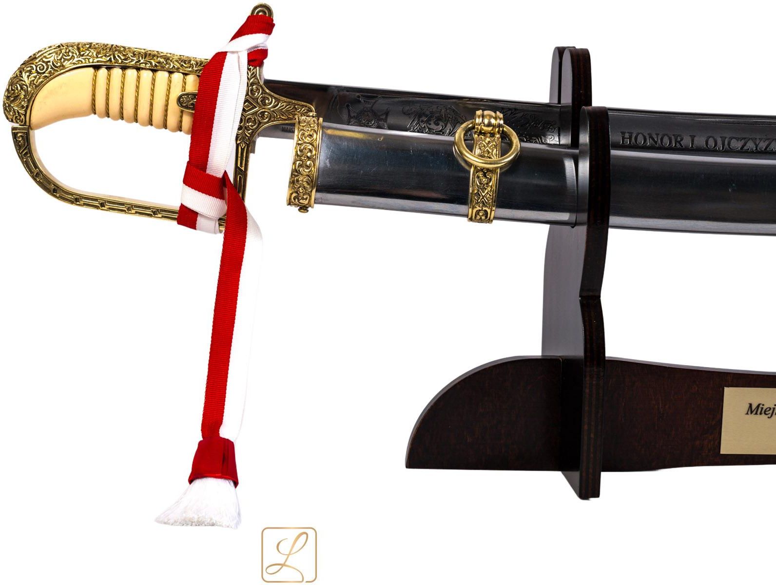 Nowa, unikatowa, hartowana szabla polska oficerska wzór 1921/1922 z pochwą + podwójny stojak + dedykacja w komplecie + ręcznie szyty temblak. Trawienie na zewnętrznym płazie: "BÓG HONOR I OJCZYZNA". Doskonała jakość! Głownia wykonana ze stali wysokowęglowej, hartowana. Szlifowana dwustronnie w zbrocze, z bogato trawionym dekorem na zewnętrznym płazie: Krzyż Virtuti Militari + godło państwowe + dewiza "BÓG HONOR I OJCZYZNA", wszystko pośród stylizowanych ornamentów roślinnych. Na zewnętrznym płazie pod nasadą tłok wytwórni Fabryki Broni Siecznej Gabriela Borowskiego: G. BOROWSKI | WARSZAWA. Wszystkie części rękojeści odlane z mosiądzu metodą traconego wosku, ozdobione efektowną, płaskorzeźbioną dekoracją. Uchwyt rękojeści wykonany z masy epoksydowej imitującej kość słoniową, 8 widocznych karbów wypełnione mosiężnym, skręconym oplotem, tzw. kordelasem. Pochwa stalowa, niklowana, z ozdobnym, mosiężnym reliefem na dwóch ryfkach i kołnierzu szyjki. Stojak wykonany ze sklejki, bejcowany, lakierowany na pół połysk. Stojak podwójny, szabla i pochwa leżą osobno. Dedykacja może zawierać Logo jednostki, blachę policyjną itp. Do szabli dodajemy dekoracyjny, ręcznie szyty temblak. Taśma w barwach narodowych, zakończona białym chwostem: Wymiary szabli: długość całkowita w pochwie - 101,5 cm długość szabli bez pochwy - 99 cm długość głowni - 85 cm długość rękojeści - 13,5 cm grubość ostrza przy rękojeści: 6,5 mm szerokość ostrza przy rękojeści: 3 cm waga szabli bez pochwy - 1,17 kg waga z pochwą: ok 1,86 kg Sposób pielęgnacji: Zaleca się co jakiś czas konserwować pochwę i ostrze szabli cienką warstwą oliwki np.: używając ciekłej parafiny (do kupienia w aptekach) Przepiękna szabla, prezent z "górnej półki". Idealny prezent dla żołnierza, kolegi odchodzącego z wojska, a także dla osób służących w innych formacjach mundurowych, militarnych czy pozamilitarnych. Realizujemy większe zamówienia dla jednostek wojskowych, funduszy oficerskich, wojskowych oddziałów gospodarczych. Wystawiamy Fvat. Replika szabli nieostrzona, wiernie odzwierciedla oryginał, jednak nie posiada żadnych cech użytkowych (w rozumieniu ustawy o broni i amunicji z dnia 21 maja 1999 r. — Dz.U. z 2012 poz. 576 wraz z późniejszymi zmianami).
