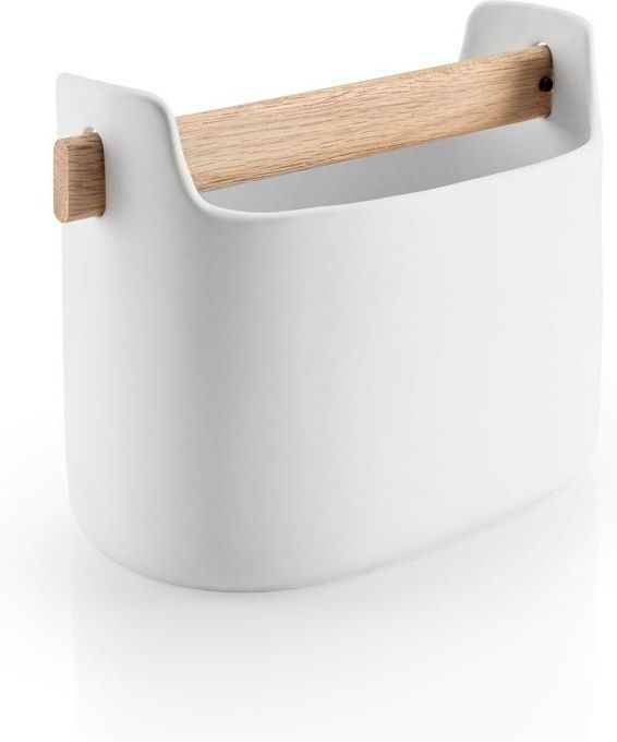 Pojemnik na przybory kuchenne lub sztućce duńskiej marki Eva Solo. Pojemnik wpisuje się w minimalistyczną skandynawską estetykę. Duża pojemność pozwala uporządkować przestrzeń na blacie kuchennym. Pojemnik sprawdzi się również jako naczynie na akcesoria do zmywania lub pojemnik na akcesoria biurowe. Do wykonania pojemnika użyte zostały biała matowa ceramika oraz naturalne drewno dębu. Materiał: ceramika, drewno dębowe Kolor: biały, naturalne drewnoWysokość: 15 cm Szerokość: 22.5 cmProjekt: Eva Solo