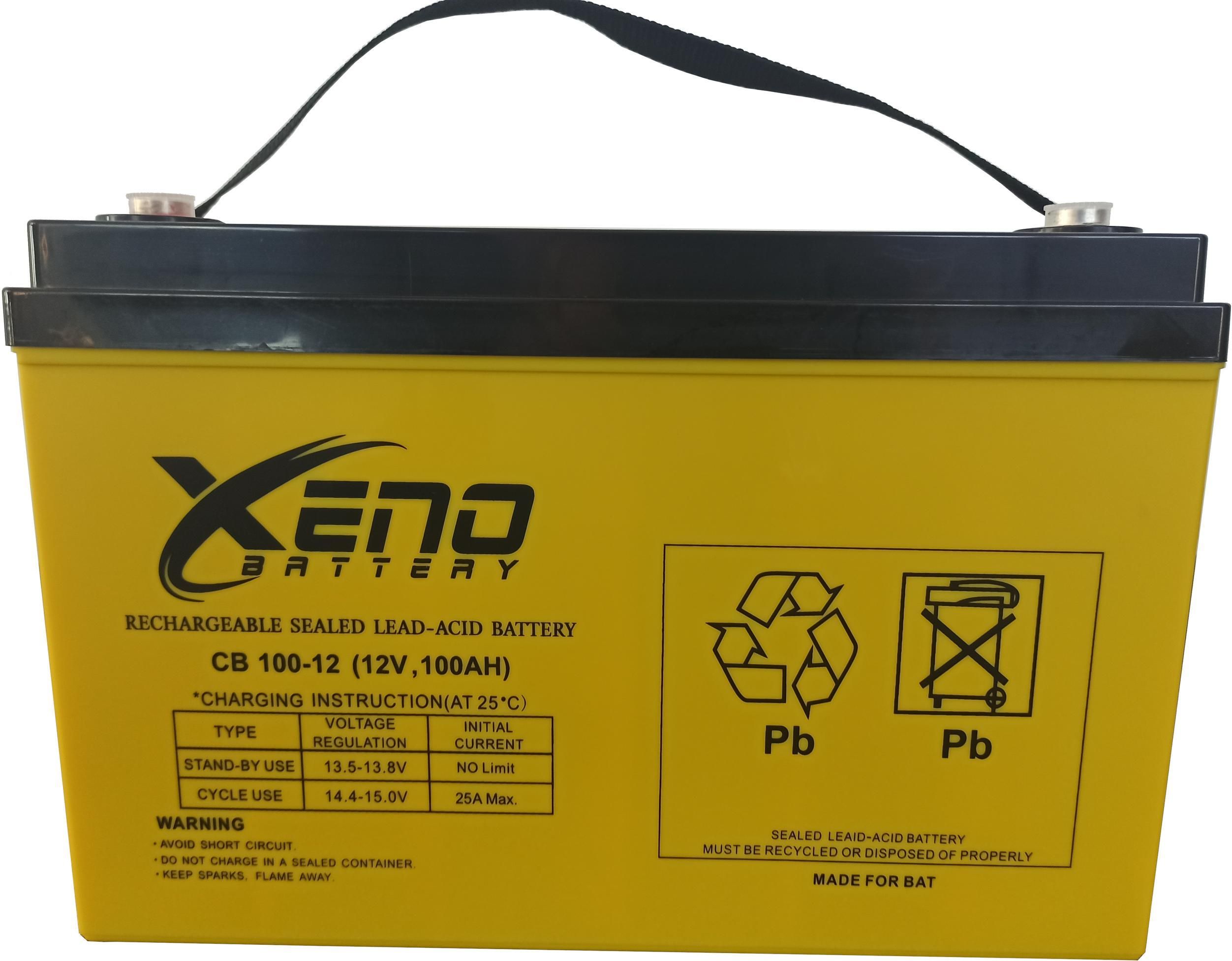 Akumulator AGM BAT Xeno 12V 100Ah CB100-12X Zasilanie-Akumulatory-AGM Akumulator AGM BAT Xeno 12V 100Ah Model: CB100-12X Najważniejsze cechy Pojemność: 100Ah Napięcie: 12V Technologia: AGM Projektowana żywotność: 10 lat Maksymalny prąd ładowania: 24A Nie wymaga uzupełniania elektrolitu Praca w dowolnej pozycji Przeznaczenie *Systemy zasilania awaryjnego *Sprzęt telekomunikacyjny *Systemy telekomunikacyjne *Systemy zasilania awaryjnego (UPS) *Zabawki, wózki elektryczne, etc. * Elektronarzędzia *Systemy alarmowe * Technologie IT * Urządzenia medyczne tyka ogólna *Systemy przeciwpożarowe Specyfikacja techniczna Napięcie nominalne: 12V Pojemność nominalna: 100Ah Wysokość całkowita: 218mm Wysokość: 213mm Szerokość: 173mm Długość: 331mm Waga: 26kg Zalecana temp robocza: 25°C±3°C Zakres temp roboczych – rozładowanie: -15°C do 50°C Zakres temp roboczych – ładowanie: -10°C do 50°C Zakres temp roboczych – składowanie: -20°C do 50°C Napięcie ładowania buforowego (25°C): 13,5VDC-13,8VDC Napięcie ładowania cyklicznego (25°C): 14,4VDC-14,7VDC Maksymalny prąd ładowania: 24A Maksymalny prąd rozładowania: 900A Projektowana żywotność (25°C): 10 lat Marka: POWERBAT Importer: B@T Sp. z o.o.Adres: 61FKościuszki, MikołówKraj: Polskae-mail importera: biuro@bat.net.pl