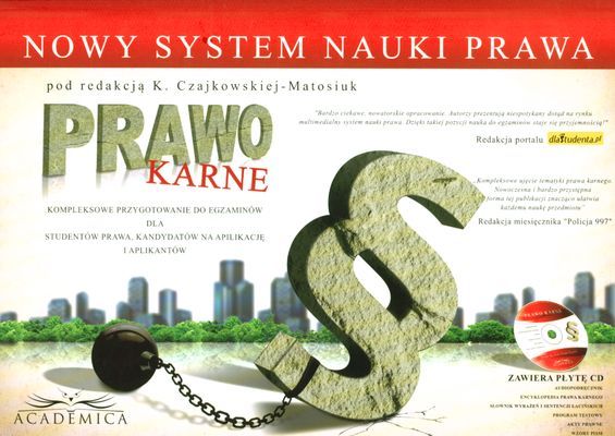 PRAWO KARNE to pierwszy podręcznik z serii NOWY SYSTEM NAUKI PRAWA wraz z multimedialną płytą CD. W wyczerpujący sposób omówiono węzłowe zagadnienia prawa karnego materialnego z odniesieniem do orzecznictwa sądowego oraz Konwencji międzynarodowych. Opracowanie zawiera stan prawny na 19 kwietnia 2010 r. oraz suplement na 8 czerwca 2010 r. PODRĘCzNIK ma na celu przygotowanie do egzaminów testowych i ustnych opisowych z prawa karnego materialnego. zawarto tu wyczerpujące omówienia z czytelnymi hasłami, podkreśleniami, wytłuszczeniami i dużą ilością wykresów oraz tabel. Po przerobieniu każdego zagadnienia można sprawdzić swoją wiedzę odpowiadając na pytania testowe i opisowe. Umożliwia to podjęcie decyzji, czy przejść już do nauki kolejnego zagadnienia, czy też należy raz jeszcze powtórzyć materiał. Na końcu każdego działu są kazusy, z którymi można spotkać się na egzaminie i które pozwalają postawić się w roli prawnika. Specyficzny format i rozkład książki sprawią, że czytelnik poczuje się jakby pracował na swoim osobistym laptopie. W każdym dziale użyto innej kolorystyki, co ułatwia i ożywia poruszanie się po książce. Podręcznik zawiera stan prawny na 19 kwietnia 2010 r. Na końcu znajduje się jednak suplement uwzględniający zmiany, jakie mają nastąpić po 8 czerwca 2010 r. Dzięki temu można samodzielnie zaktualizować treść książki po wejściu w życie tych zmian.