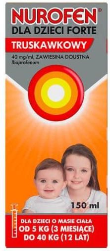 Nurofen dla dzieci Forte zawiesina charakteryzuje przede wszystkim formuła, która zapewnia odpowiednio silne działanie dzięki skoncentrowanej zawartości Ibuprofenu, co sprawia, że dziecko przyjmuje mniej płynu do połknięcia. Dodatkowo posiada bardzo wygodną oraz precyzyjną w podaniu strzykawkę, co zapewnia bezpieczeństwo jeśli chodzi o ilość leku. Wskazania do stosowania to leczenie gorączki różnego pochodzenia, w tym także: objawowe, krótkotrwałe leczenie bólu o nasileniu małym do umiarkowanego oraz objawowe, krótkotrwałe leczenie gorączki. Składniki Każdy 1 ml zawiesiny zawiera 40 mg ibuprofenu. Sposób użycia Lek Nurofen dla dzieci Forte truskawkowy należy zawsze stosować tak, jak to opisano w ulotce dla pacjenta lub według zaleceń lekarza lub farmaceuty. W razie wątpliwości należy zwrócić się do lekarza lub farmaceuty. Lek do stosowania doustnego.Lek ten jest przeznaczony tylko do krótkotrwałego stosowania. Przechowywanie Lek należy przechowywać w miejscu niewidocznym i niedostępnym dla dzieci.Nie stosować leku Nurofen dla dzieci Forte truskawkowy po upływie terminu ważności zamieszczonego na pudełku tekturowym oraz na butelce. Nie przechowywać w temperaturze powyżej 25°C. Po otwarciu butelki lek należy zużyć w ciągu 6 miesięcy. Przed użyciem zapoznaj się z ulotką, która zawiera wskazania, przeciwwskazania, dane dotyczące działań niepożądanych i dawkowanie oraz informacje dotyczące stosowania produktu leczniczego, bądź skonsultuj się z lekarzem lub farmaceutą, gdyż każdy lek niewłaściwie stosowany zagraża Twojemu życiu lub zdrowiu. PKWIU 21.20.1 Rodzaj EAN 5909991422158 BLOZ_07 5992666 None