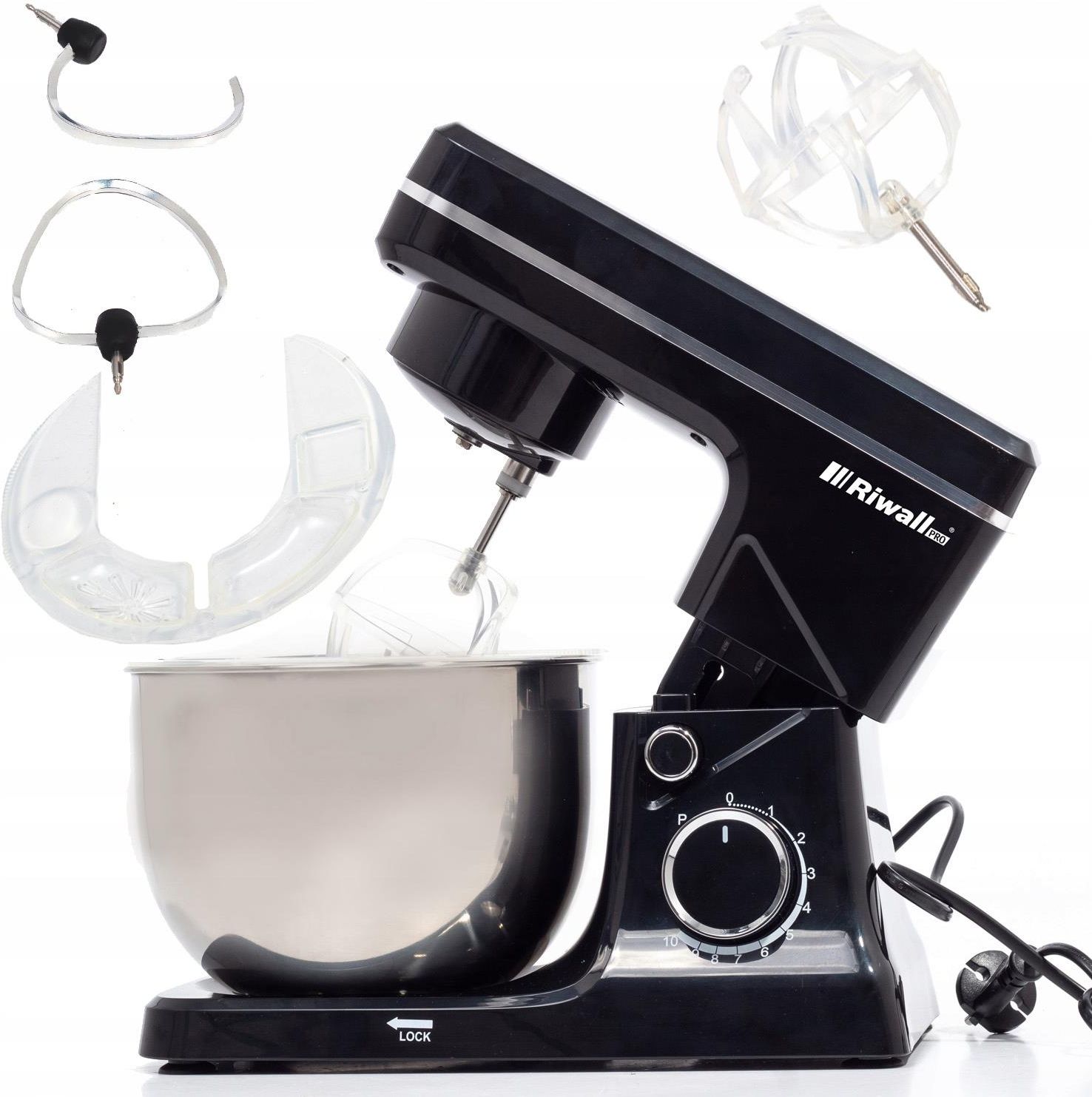 ROBOT KUCHENNY 6w1 PLANETARNY MIKSER 2500W 5L DO CIASTA RIWALL KICIA RKC-01 CO WYRÓŻNIA NASZ PRODUKT **WYJĄTKOWA MOC I WYDAJNOŚĆ** - Silnik 2500W-2700W max z hartowaną metalową przekładnią oraz 10-stopniową regulacją prędkości zapewnia perfekcyjne rezultaty przy każdym użyciu. **ZAAWANSOWANE SYSTEMY BEZPIECZEŃSTWA** - Komplet zabezpieczeń: blokada bezpieczeństwa, ochrona przed przegrzaniem, zatrzymanie przy podniesionej głowicy oraz wskaźniki LED gwarantują bezpieczne użytkowanie. **PREMIUM JAKOŚĆ WYKONANIA** - Misa ze stali nierdzewnej 4l, solidny metalowy zawias oraz stylowy design czarny z inox zapewniają trwałość i elegancję na lata. **KOMPLETNE PROFESJONALNE WYPOSAŻENIE** - Hak odlewany, mieszadło, timer, osłona przeciwbryzgowa oraz system rotacji planetarnej - wszystko czego potrzebujesz w jednym urządzeniu. PROFESJONALNA MOC W DOMOWEJ KUCHNI! Ten wysokiej jakości robot planetarny RIWALL-PRO wyposażony w silnik o mocy znamionowej 2500W-2700W max oraz hartowaną metalową przekładnię zapewnia niezawodną pracę nawet z najcięższymi ciastami. Dzięki 10-stopniowej regulacji prędkości oraz systemowi rotacji planetarnej, każdy składnik zostanie idealnie wymieszany, a Ty osiągniesz perfekcyjne rezultaty jak prawdziwy mistrz kuchni. BEZPIECZEŃSTWO I KOMFORT UŻYTKOWANIA NA NAJWYŻSZYM POZIOMIE! Robot wyposażony w zaawansowane systemy zabezpieczeń: blokadę bezpieczeństwa, zabezpieczenie przed przegrzaniem, zatrzymanie pracy przy podniesionej głowicy oraz blokadę ramienia mieszającego gwarantuje całkowite bezpieczeństwo podczas użytkowania. Timer oraz ledowy wskaźnik zasilania informują o stanie pracy, a osłona przeciwbryzgowa zapewnia czystość podczas miksowania. TRWAŁOŚĆ I ELEGANCJA W KAŻDYM DETALU! Wykonany z najwyższej jakości materiałów, z misą ze stali nierdzewnej o pojemności 4l oraz solidnym metalowym zawiasem, robot zapewnia wieloletnią niezawodność. Stylowy czarny design z elementami inox nie tylko gwarantuje funkcjonalność, ale także stanowi prawdziwą ozdobę każdej nowoczesnej kuchni. KOMPLETNE WYPOSAŻENIE DO WSZYSTKICH POTRZEB KULINARNYCH! W zestawie znajdziesz profesjonalne akcesoria: mocny hak odlewany do wyrabiania ciężkich ciast, mieszadło do ucierania oraz blokadę Segwanic. Wszystko to uzupełnia praktyczny metrowy przewód zasilający, który zapewnia swobodę pracy w każdej kuchni. To więcej niż robot kuchenny - to Twój niezawodny partner w tworzeniu kulinarnych arcydzieł. SPECYFIKACJA Stan: Nowy Marka: Riwall Kolor dominujący: czarny Model: KICIA RKC-01 Moc nominalna: 2700 W Rodzaj regulacji obrotów: skokowa Liczba poziomów prędkości: 10 Tryby pracy: brak Pojemność misy roboczej: 4 l Cechy dodatkowe: METALOWA PRZEKŁADNIA Załączone wyposażenie: POKRYWA DO MISY Z OPCJA DOKLADANIA PODCZAS PRACY Szerokość produktu: 44 cm Wysokość produktu: 40 cm Głębokość produktu: 26.5 cm Waga produktu: 6 kg Waga produktu z opakowaniem jednostkowym: 7 kg Kod producenta: KICIA RKC-01 EAN (GTIN): 5907080481321 Stan opakowania: oryginalne Informacje o bezpieczeństwie: CE Bezpieczeństwo: automatyczne zatrzymanie podczas podniesienia głowicy, blokada bezpieczeństwa, blokada pokrywy, blokada ramienia mieszającego, nóżki antypoślizgowe, wyłącznik bezpieczeństwa, zabezpieczenie przed nieprawidłowym montażem, zabezpieczenie przed przegrzaniem Funkcje: mieszanie, miksowanie, ubijanie, ucieranie, wyrabianie ciasta