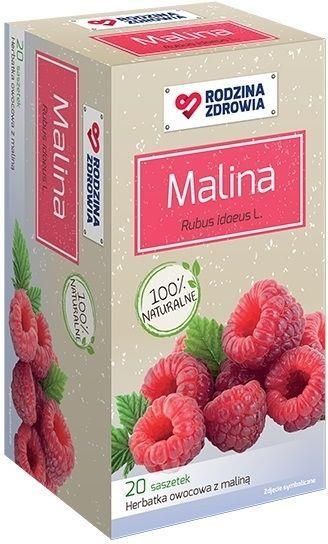 RODZINA ZDROWIA HERBATKA OWOCOWA MALINA Wskazania: Rodzina Zdrowia Herbatka owocowa Malina dostarcza organizmowi człowieka witaminy z grupy B, witaminy: C, K, E oraz składniki minerane takie jak: cynk, magnez, miedź, mangan, fosfor i żelazo, które wykazuja korzystny wpływ na nasze zdrowie. Malina jest równiez źródłem błonnika pokarmowego. Właściwości: Herbatka owocowa Malina Rodzina Zdrowia jest w 100% naturalnym produktem, który nie zawiera aromatów ani barwników. Owoce malin zawierają witaminy z grupy B, witaminy C, E i K oraz składniki mineralne. Są również źródłem kwasu cytrynowego i jabłkowego, pektyn, antocyjanin, a także błonnika pokarmowego, który dobroczynnie oddziałuje na układ pokarmowy. 200 g świeżych malin pozwala pokryć 100% dzienne zapotrzebowanie dorosłego człowieka na witaminę C. Ta uczestniczy w wielu procesach zachodzących w naszym organizmnie i jest niezbędna dla jego prawidłowego funkcjonowania. Między innymi, wspomaga ona układ odpornościowy, bierze udział w produkcji kolagenuzapewnieniając prawidłowe funkcjonowanie naczyń krwionośnych, kości, chrząstki, dziąseł, zębów i skóry,a takżeprzyczynia się do utrzymania prawidłowego metabolizmu energetycznego. Skład: owoc maliny (Rubus ideaus L.) 50%, kwiat hibiskusa (Hibiscus sabdariffa L.), ziele mięty (Mentha piperita L.), owoc aronii (Aronia melanocarpa ), owoc jabłka (Malus domestica ), aromat naturalny malinowy Stosowanie: Saszetkę umieść w filiżance, zalej 200 ml wrzącej wody i zaparz pod przykryciem przez 5-8 minut. Jedna saszetka przeznaczona jest do przygotowania jednej filiżanki naparu. Opakowanie: 20 saszetek x 2 g