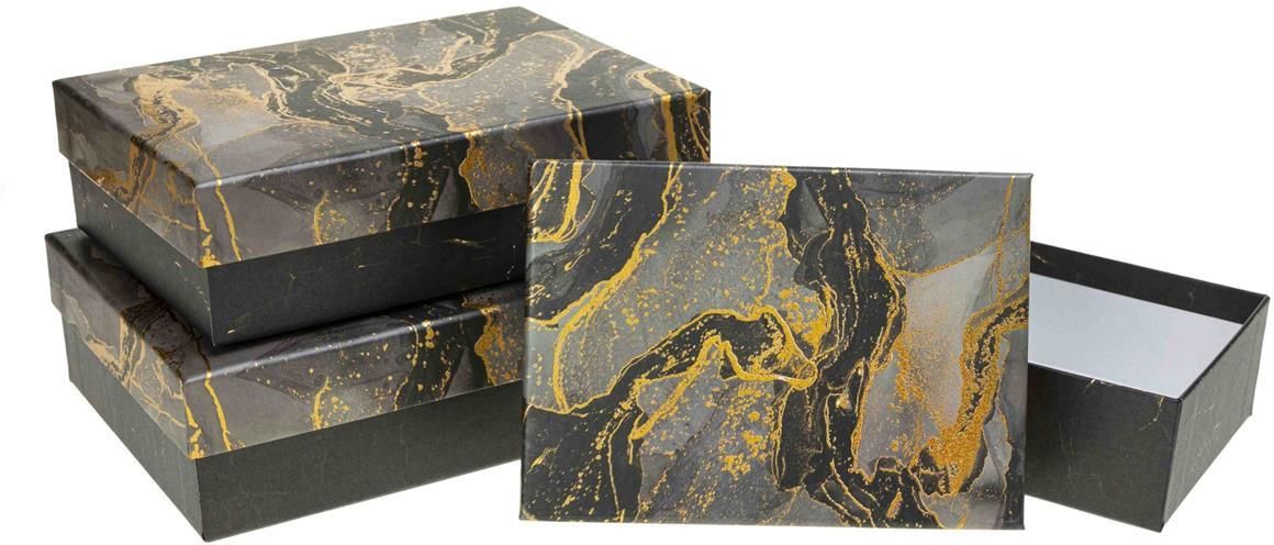 Zestaw Pudełek Ozdobnych, Kształt prostokątny, Kolor czarny/marmur, Materiał: tektura - Zestaw 3 szt. - Wymiary: S: 19*13.5*6 M: 22*16*6,5 L: 24,5*17,5*7, Uszlachetnienie - złocenie Wysokość: 245 Szerokość: 175 Głębokość: 71.000000 Grupa wiekowa: + Isbn: 5907354095629 Rodzaj: Artykuły papiernicze