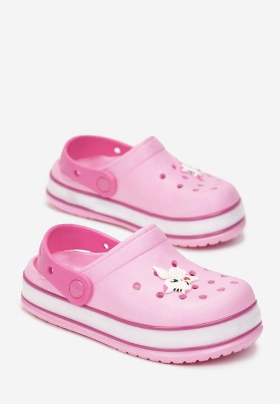 Klapki Koloise z piankowego gumowego tworzywa. Osadzone na grubej podeszwie z lampkami, wsuwane z paskiem podtrzymującym stopę, z przodu ozdobne wycięcia. Kolor: Różowy Rozmiarówka: Typowa Tęgość stopy: Neutralny Rodzaj obcasa: Płaski Wkładka/wyściółka: Guma Materiał: Guma Nosek buta: Okrągły Zapięcie: Wsuwany/otwarty Sezon: Całoroczny