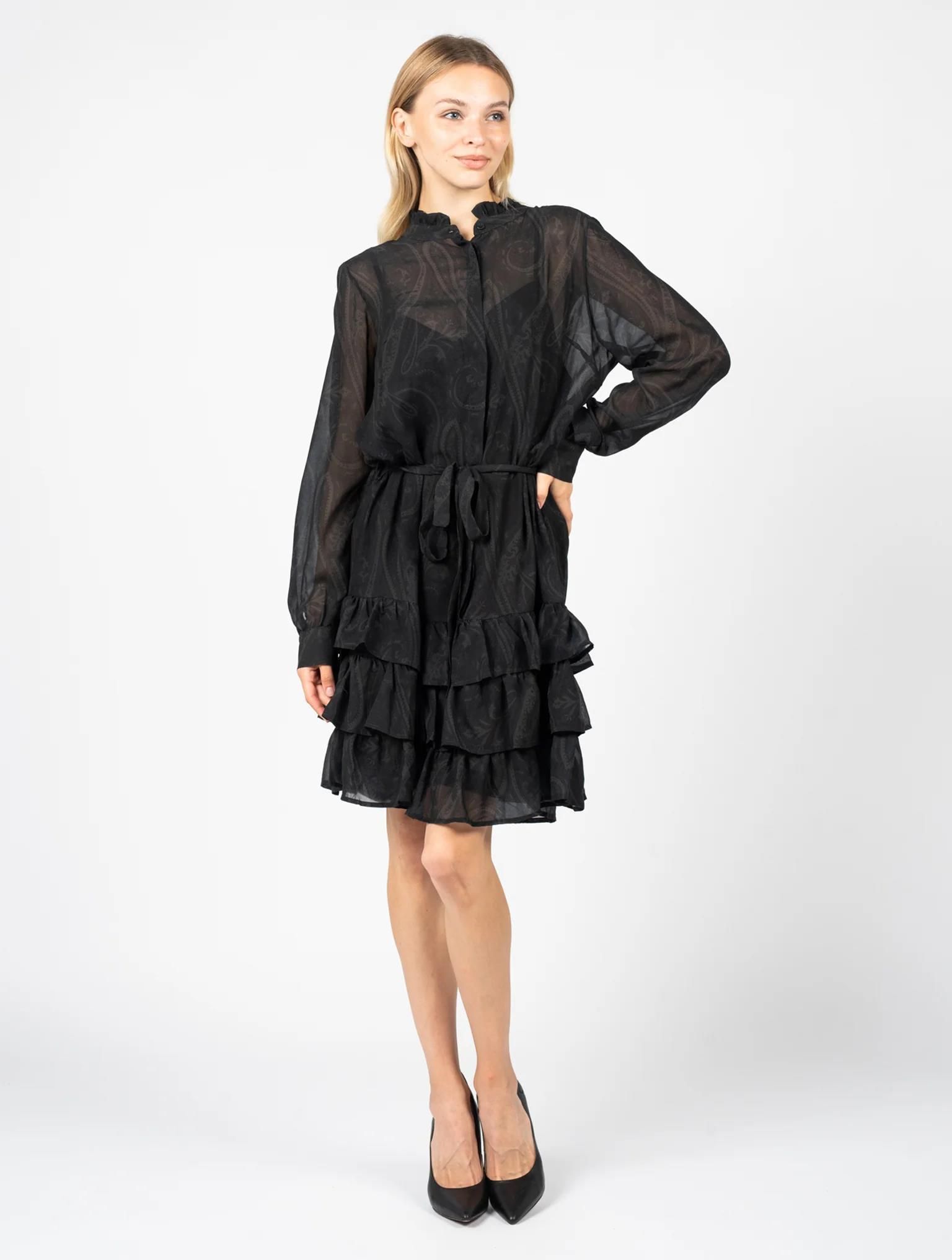 Prosty fason Długość midi, do kolan Zapinana na guziki Na stójce Z długim rękawem Mankiety zapinane na guziki Z dołączoną halką W pasie wiązana Dół ozdobiony falbanami Wykonana z wysokiej jakości tkaniny Wyprodukowana we Włoszech