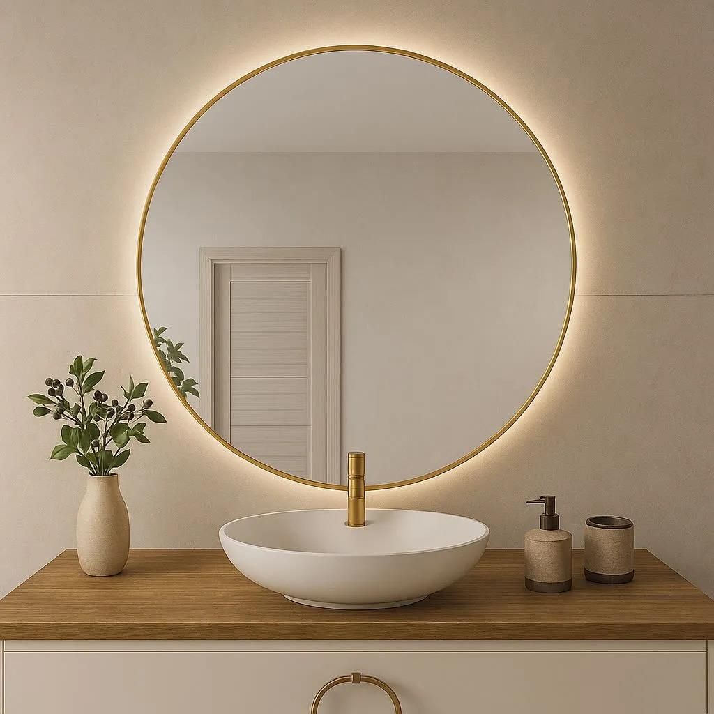 Lustro w wąskiej złotej ramie z oświetleniem Lustro ma wąską złotą ramę o szerokości 8 mm.Rama wykonana jest z precyzją, w odcieniu złota który nadaje wnętrzu ciepła i blasku.Wyposażone jest w zintegrowany z ramą sensorowy włącznik światła. Bezdotykowa technologia pozwala na włączanie i wyłączanie oświetlenia jednym prostym gestem. Oświetlenie LED rozświetla przestrzeń wokół lustra, podkreśla złociste tony ramy, tworzy przytulną atmosferę w pomieszczeniu.Lustro można też zakupić z Białą , Czarną lub Srebrną ramą.Jak mogą wyglądać lustra w złotej ramie w trzech różnych wnętrzach? Czytaj tu . Instrukcja montażu Instrukcja instalacji jest dostępna do pobrania dla każdego modelu okrągłego lustra. Pytania / odpowiedzi P: Czy przy wyborze lustra z matą grzewczą bez czujnika sensorowego trzeba przygotować dwa osobne gniazdka elektryczne? O: Potrzebne jest tylko jedno gniazdko z wyprowadzeniem kabla w miejscu gdzie będzie zawieszone lustro . Mata grzewcza i oświetlenie led są włączają i wyłączają się jednocześnie. P: Co to znaczy, że lustro ma sensor i matę grzewczą? O: W standardzie lustro nie jest wyposażone ani w sensor ani w matę grzewczą. Oświetlenie włączane jest za pomocą przycisku, który należy zainstalować w ścianie. Mata grzewcza podgrzewa szkło lustra, dzięki czemu lustro nie paruje. Sensor pozwala na włączanie światła za pomocą gestu ręki, przez co nie ma potrzeby montowania przycisku w ścianie.