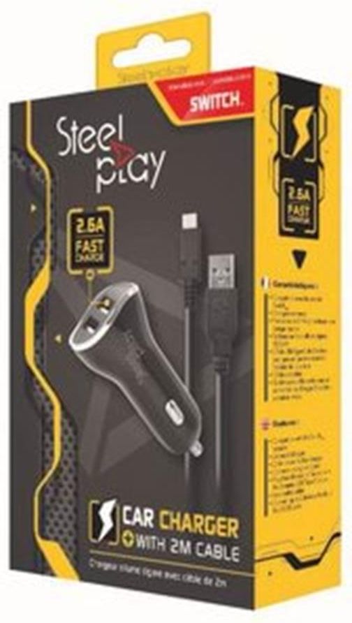 STEELPLAY Car Charger Dual Port 2.6A Producent: STEELPLAY Produkt Nazwa: STEELPLAY Car Charger with 2 USB Ports 2.6A + 2m Charge Cable Switch Opis: Steelplay - Zasilacz samochodowy - 2.6 A - 2 złącza wychodzące (USB) - przewodowo: USB-C - dla Nintendo Switch EAN: 3760210990870 Ogólne Rodzaj produktu: Zasilacz samochodowy Przeznaczony dla: Konsola przenośna Szerokość: 3.3 cm Głębokość: 6.5 cm Waga: 114 g Zasilacz Złącza wejściowe: Zapalniczka samochodowa Liczba Złącz Wejścia: 1 Złącza wychodzące: Wszystkich 2: 4 pin USB Typ A Rozłączany typ złącza przewodu: USB-C Maksymalne natężenie prądu: 2.6 A Cechy: Ładuje jednocześnie maksymalnie 2 urządzenia Różne Dołączone przewody: Z kabla USB-C na USB-A - 2 m Informacja o kompatybilnosci Zaprojektowany dla: Nintendo Switch
