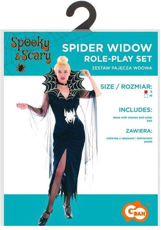 Strój pajęcza wdowa W skład stroju wchodzi: sukienka z rękawami i kołnierzem, pasek Rozmiar: S Kolor: czarny, biały Materiał: 100% poliester Producent: Godan Format: 330x250 mm