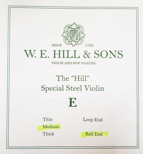 Struna pojedyncza E do skrzypiec HILL- materiał: stalowa- naciąg: średni, medium- końcówka: ball end