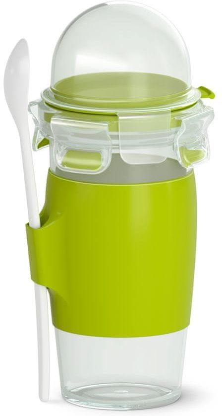 Kubek na jogurt z nakładką TEFAL MasterSeal 0,45 l Model: N1071410 Zabierz ze sobą jogurtu i wszystkie ulubione dodatki! Dzięki pojemnikowi MasterSeal To Go teraz możesz cieszyć się pysznym i zdrowym jogurtem gdziekolwiek jesteś. Szczelnie przylegająca pokrywka umożliwia bezpieczny transport jogurtu, a dodatkowa osobna przestrzeń służy do przenoszenie ulubionych dodatków. Korzystanie z pojemnika ułatwia dołączona łyżka oraz wygodny uchwyt do trzymania. CMMF: 3110600389 Bezpieczny transport 100% szczelności Dokładnie przylegająca pokrywka na zatrzaski zapewnia wyjątkową szczelność. Dzięki temu możesz przenosić pojemnik bez obawy o przeciekanie i pobrudzenie torby, czy plecaka. Dokładnie tak jak lubisz 2-funkcyjna pokrywka Szczelnie przylegająca pokrywka umożliwia bezpieczny transport jogurtu, a jej dodatkowa przestrzeń służy do przenoszenie ulubionych dodatków (musli, orzechy czy owoce). Rozwiązanie smart Wygodny uchwyt i łyżka Korzystanie z pojemnika ułatwia dołączona łyżka oraz wygodny uchwyt do trzymania. Wyjątkowa wygoda Produkt można myć w zmywarce. Pojemnik nadaje się do używania w kuchenkach mikrofalowych i przechowywania w zamrażarce Dzięki pojemnikowi MasterSeal To Go teraz możesz cieszyć się pysznym i zdrowym jogurtem gdziekolwiek jesteś. Szczelnie przylegająca pokrywka umożliwia bezpieczny transport jogurtu, a dodatkowa osobna przestrzeń służy do przenoszenie ulubionych dodatków takich jak musli, orzechy czy owoce. Wystarczy wrzucić dodatki do jogurtu i wymieszać całość, aby delektować się pyszną i zdrową przekąską! Korzystanie z pojemnika ułatwia dołączona łyżka oraz wygodny uchwyt do trzymania. Produkt można myć w zmywarce i nadaje się do używania w kuchenkach mikrofalowych i przechowywania w zamrażarce. Wyprodukowano w Niemczech bez bisfenolu A (BPA) - to bezpieczny wybór dla Ciebie i Twojej rodziny.