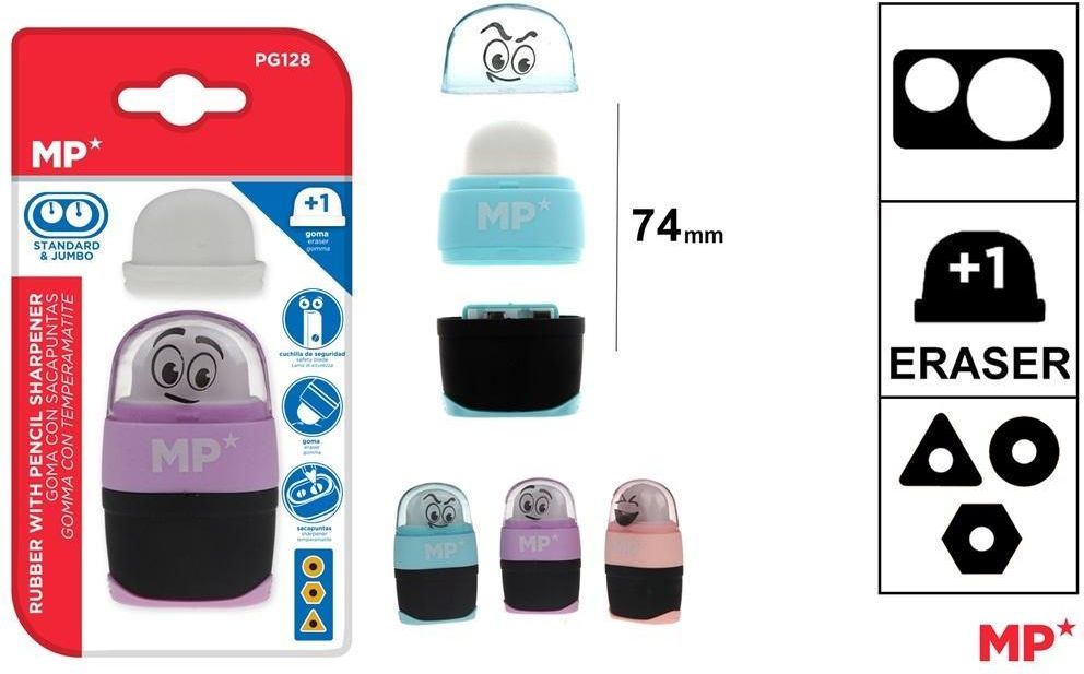 Temperówka z gumką MIX MP Main Paper Gumka z temperówką i nasadką ochronną ze śmiesznymi buziami. Miękka biała gumka do łatwego wycierania.2-użyciowa temperówka: ołówki standardowei ołówki Jumbo. Ergonomiczna i łatwa dotrzymania konstrukcja. Blister 1 sztuka. Wydawnictwo: MP Main Paper