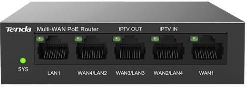 Router TENDA G0-5G-PoE Tenda G0-5G-PoE to uniwersalny router, w tym przełącznik PoE, który dodatkowo zawiera kontroler pro Access Pointów marki Tenda. Dzięki temu routerowi, przełącznikowi PoE i kontrolerowi w jednym można go używać pro mniejszych instalacji punktów dostępu, kamer PoE itp. Główne zalety Budżet PoE do 55 watów pro zasilania zewnętrznych kompatybilnych urządzeń Z funkcją MultiWan Można zarządzać do 16 AP Dzięki temu urządzeniu można zarządzać do 16 punktów dostępu WiFi. Urządzenie G0-5G-PoE automatycznie skanuje całą sieć i dodaje wszystkie znalezione AP do mangementu, a także automatycznie ustawia początkowe nazwy punktów dostępu według adresów Mac, ich wydajności, bezpieczeństwa itp. Dzięki 5 gigabitowym portom (1x WAN, 1x LAN, 3x WAN/LAN) i funkcji MultiWAN można wybrać, jak każdy port zostanie skonfigurowany oddzielnie, aby zapewnić pełną przepustowość. Z centralnym zarządzaniem Obsługuje standardy Fast Roaming IEEE 802.11k/v/r i własny serwer DHCP pro podłączonych urządzeń. Oferuje zasilanie PoE Dzięki zasilaniu PoE możliwe jest zasilanie za pomocą G0-5G-PoE maks. 4 urządzeń PoE+ z normą 802.3af/at i łącznie 55W. Tenda G0-5G-PoE to router odpowiedni zarówno dla małych i średnich firm, jak i gospodarstw domowych. Silne zabezpieczenia W tym samym czasie można podłączyć łącznie do 16 punktów dostępu WiFi AP. Kluczowe cechy Gigabitowy router z PoE Maks. Liczba klientów: 150 Maks. Liczba sesji: 4 000 Maks. liczba jednoczesnych sesji: 42 000 NAT (Static IP): 940Mbps/930Mbps NAT (DHCP) 941Mbps/932Mbps Kontrola punktów dostępu - 16 szt. AP VLAN: 4x Sprzęt: dwurdzeniowy procesor, 1,0 GHz, RAM 128 MB, FLASH 16 MB Porty: 5x Gigabit Ethernet (1x WAN, 1x LAN, 3x WAN/LAN) PoE: 802.3 af/at PoE+, porty LAN1 do LAN4, łącznie 55W Ustawienia Wi-Fi: Grupa AP, Polityka SSID, Polityka RF, Polityka VLAN, Polityka konserwacji, Polityka alarmów, Polityka wdrażania Routing statyczny: routing, routing zasad Zabezpieczenia: IP-MAC binding, Block Ping from WAN, DDoS Attack Defense, ARP Attack Defense, Binary Association