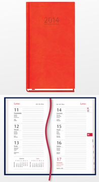 Format: 90/165 mm Rodzaj papieru: offset 70g/m² biały Układ kalendarium: 1 tydzień - 2 strony Ilość stron: 144 Druk: 2 kolory Oprawa: skóropodobna Vivella Jedna tasiemka