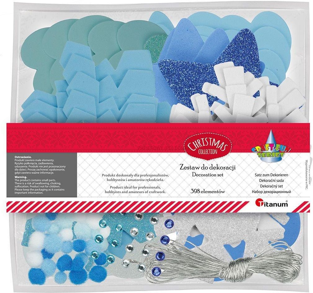 Piankowy zestaw do dekoracji niebieski Titanum Ten niezwykle kreatywny piankowy zestaw do dekoracji w kolorze niebieskim od Titanum to świetna zabawa dla dzieci, pozwalająca na rozwijanie wyobraźni i zdolności manualnych. Składa się z aż 398 elementów, które idealnie sprawdzą się podczas ozdabiania różnych przedmiotów oraz tworzenia własnych projektów.W skład zestawu wchodzą: - piankowe kształty w różnych formach, które doskonale sprawdzą się jako baza do twórczych dekoracji, - pompony poliestrowe o różnych wielkościach, które idealnie dopełnią całości kompozycji, - kryształki samoprzylepne o różnorodnych kształtach, które doda elegancji i kolorystycznego uroku każdemu projektowi, - sznurek, który pozwoli na zawieszenie przestrzennej aplikacji lub spięcie elementów dekoracji razem.Korzystając z podanych materiałów, zarówno dzieci, jak i dorośli, mogą tworzyć niesamowite i unikalne dekoracje do domu, szkoły czy przedszkola. Ten zestaw do dekoracji pozwoli na wspólne, twórcze zabawy oraz naukę sztuki zdobienia.Dzięki prostocie użycia oraz kreatywnemu potencjałowi tego zestawu, każdy będzie mógł w pełni wyrazić swoją wyobraźnię i zrealizować swoje artystyczne wizje. EAN: 5907437710333