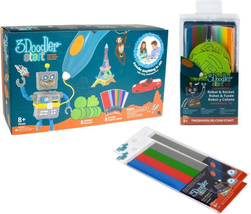 Daj wyraz swojej kreatywności i pobudź wyobraźnię dzięki 3Doodler- długopisowi 3D, który powstał specjalnie z myślą o najmłodszych użytkownikach! 3Doodler umożliwia tworzenie trójwymiarowych obiektów w czasie rzeczywistym. Wystarczy włożyć specjalny eko-wkład, który jest podgrzewany wewnątrz urządzenia, dzięki czemu nabiera właściwości plastycznych i pozwala dzieciom tworzyć dowolne kształty. Jest całkiem bezpieczny (nie nagrzewa się) i prosty w użyciu. Jedno naładowanie baterii długopisu (za pomocą mikro USB) pozwala na 45-60 minut zabawy! Zestaw zawiera: długopis 3d, 8 zestawów wkładów w różnych kolorach (razem 192 szt.), 8 szablonów, książkę projektów, kabel usb oraz instrukcję. Dla dzieci w wieku od 8 lat