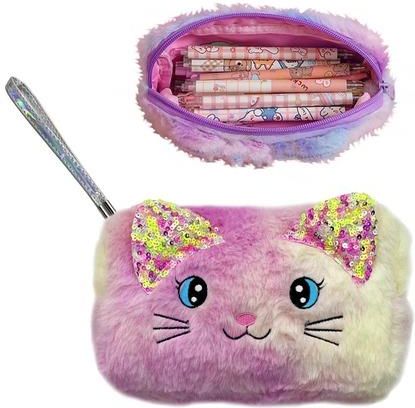 Torebka kotek zapinana na zamek. Wykonana z pluszowego materiału w pastelowych kolorach. Format: 118x258 mm