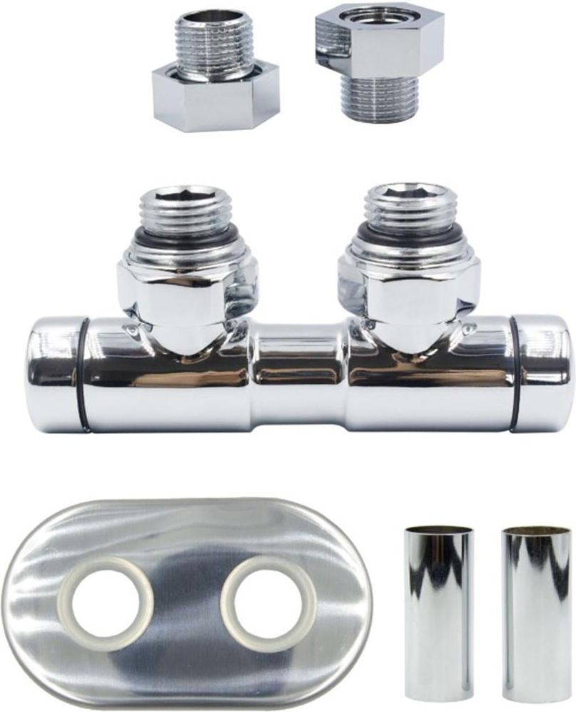 Zestaw Twins Odcinający przeznaczony jest do instalacji o rozstawie przyłączy 50 mm, do grzejników z połączeniem dolnym. W skład zestawu wchodzi: 1 przyłącze kątowe, 1 rozeta maskująca podwójna owalna, 2 tuleje maskujące i 2 złączki do instalacji alu-pex 16 mm lub miedzianej Cu 15 mm lub do instalacji 1/2 - złączki jeden wariant do wyboru. Spośród dostępnych opcji należy wybrać komplet ze złączkami pasującymi do Państwa instalacji.