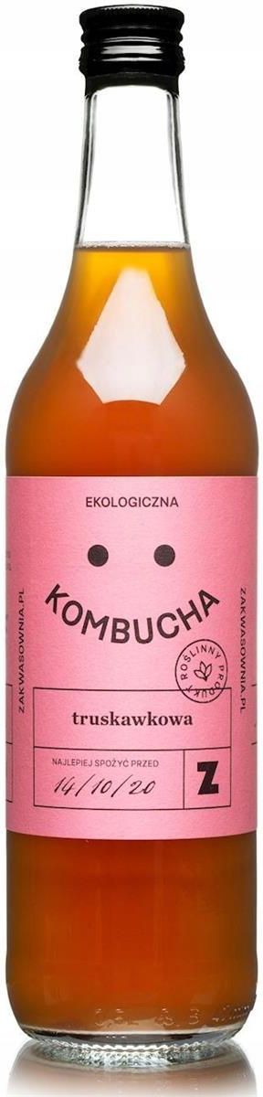 KOMBUCHA TRUSKAWKOWA BIO 270 ml - ZAKWASOWNIASKŁADNIKI napar z zielonej herbaty* 95 % (woda, cukier trzcinowy*, zielona herbata* 1 %, żywe kultury scoby*), syrop truskawkowy* 5 % (sok z truskawek*, cukier trzcinowy*). (*certyfikowany składnik ekologiczny) OPIS Napój naturalnie musujący na bazie naparu z herbaty z syropem truskawkowym poddany procesowi fermentacji. Ma przyjemny, lekko kwaskowaty smak. Jest idealną alternatywą dla piw i napojów gazowanych. WARTOŚĆ ODŻYWCZA W 100 ml Wartość energetyczna: 18 kJ/4 kcal Tłuszcz: <0,1 g w tym kwasy tłuszczowe nasycone: 0 g Węglowodany: <0,5 g w tym cukry: <0,5 g Białko: 0 g Sól: 0 g INFORMACJA ALERGENNA Może zawierać SOJĘ, GORCZYCĘ, ORZECHY, ORZESZKI ZIEMNE, nasiona sezamu. UWAGA Napój może zawierać do 1,2 % alkoholu. Jeżeli w Twojej butelce widzisz zawiesinę, jest to naturalny grzyb herbaciany. Wykorzystaj go do przygotowania własnej kombuchy. ZALECANE WARUNKI PRZECHOWYWANIA Przechowywać w lodówce w temperaturze od +2°C do +8°C. Po otwarciu spożyć w ciągu 7 dni.