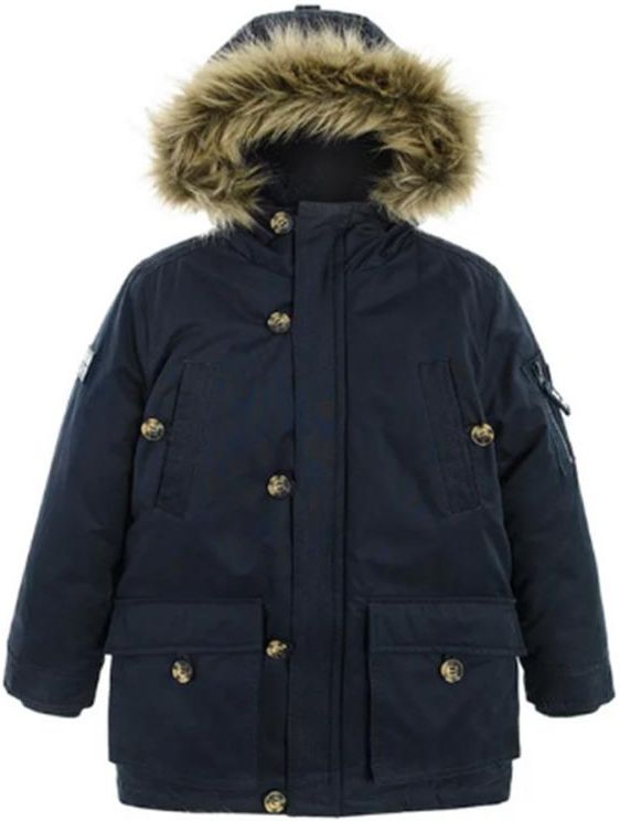 Kurtka zimowa z kapturem dla chłopca: - kolor: granatowy - doszyty kaptur z odpinanym futerkiem - zapięcie na suwak z zabezpieczeniem pod szyją - dodatkowe zapięcie na guziki - kieszenie zapinane na guziki - kieszonka na ramieniu zapinana na suwak - gumowa naszywka na rękawie - z tyłu naszywka z napisem: "Mountain Explorer" - wewnątrz kieszonka zapinana na rzep - futerkowe ociepelnie Materiał i technologie: - wodoodporny materiał zewnętrzny 1000 WP - 50% poliester, 39% bawełna, 11% poliamid - futerkowa podszewka - 100% poliester - wypełnienie - 100% poliester (gramatura: 260 g/m2) - wypełnienie rękawów - 100% poliester (gramatura: 220 g/m2)