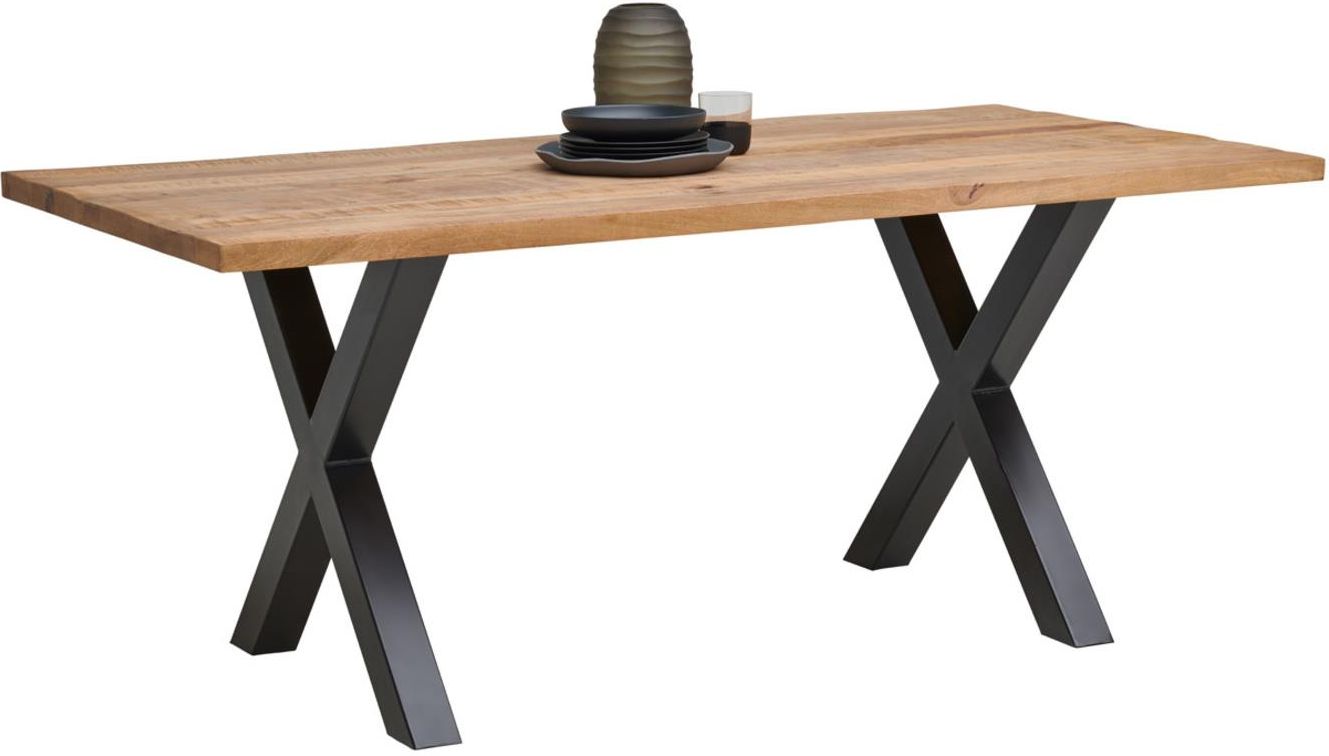 Stół drewniany MIRA 180 × 90 × 77 cm mango / czarny – naturalny urok drewna i nowoczesny design Stół Mira to solidny i stylowy mebel, który stanie się centralnym punktem każdej jadalni. Blat wykonany z litego drewna mango zachwyca naturalnym usłojeniem i ciepłym, przyjemnym odcieniem, nadając wnętrzu wyjątkowego charakteru. Stabilna podstawa w formie czarnych, metalowych nóg w kształcie litery X łączy nowoczesny industrialny styl z naturalnym pięknem drewna. Dzięki wymiarom 180 × 90 × 77 cm stół zapewnia komfortowe miejsce dla 6–8 osób, co czyni go idealnym zarówno do codziennych posiłków, jak i większych spotkań w gronie rodziny czy przyjaciół. Solidna konstrukcja i gruby blat gwarantują trwałość, dzięki której stół Mira posłuży przez wiele lat. Najważniejsze zalety: Blat z litego drewna mango – unikatowe usłojenie, trwałość i solidność Metalowe nogi w kształcie litery X – stabilne, stylowe, industrialny charakter Wymiary 180 × 90 × 77 cm – wygodna przestrzeń dla 6–8 osób Połączenie ciepłego drewna i czarnego metalu – idealne do nowoczesnych, loftowych i rustykalnych aranżacji Solidna konstrukcja – mebel wytrzyma codzienne użytkowanie Styl i aranżacja: Stół Mira doskonale komponuje się z różnymi wnętrzami – w zestawieniu z ciemnymi, tapicerowanymi krzesłami podkreśli industrialny klimat, natomiast w połączeniu z jasnymi dodatkami stworzy przytulną, rodzinną atmosferę. To mebel dla osób, które chcą łączyć naturalne piękno drewna z wyrazistą formą współczesnego designu.