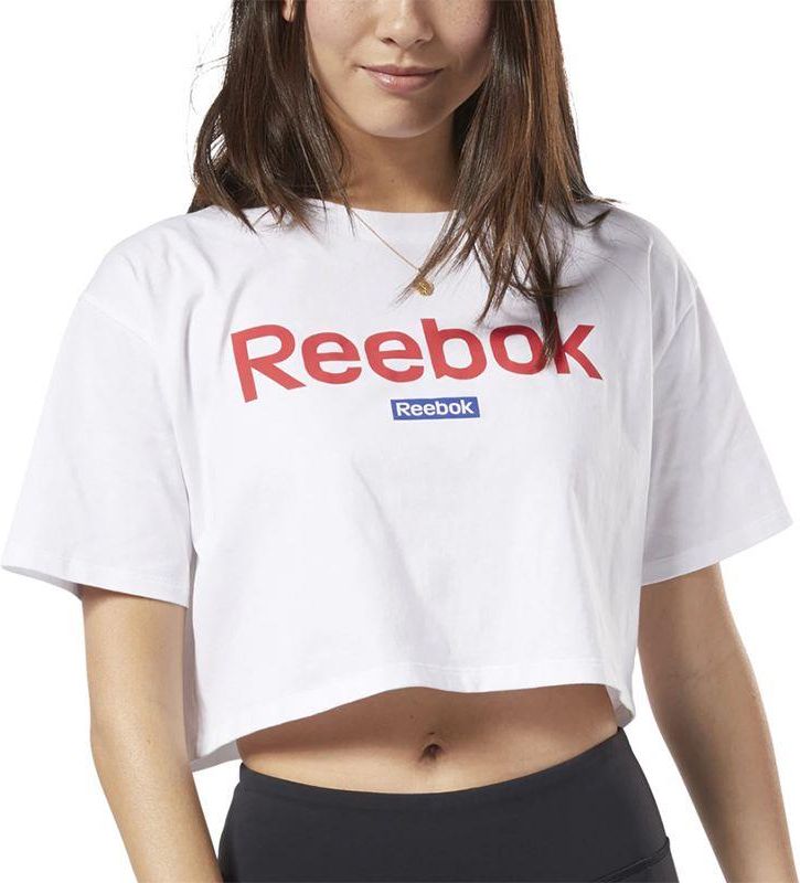 KOSZULKA REEBOK TRAINING ESSENTIALS LINEAR LOGO CROP TEE FI2031 DAMSKA, BIAŁA Damska koszulka o skróconym fasonie od Reebok ozdobiona dużym brandingiem producenta na klatce piersiowej. Wykonana została z miękkiej i miłej w dotyku, bawełnianej dzianiny. Luźny krój i zaokrąglony dekolt zapewniają komfortowe dopasowanie i nie krępują zakresu ruchów. Specyfikacja: - materiał: 100% bawełna - zaokrąglony dekolt - krótkie rękawki - skrócony fason - luźny krój