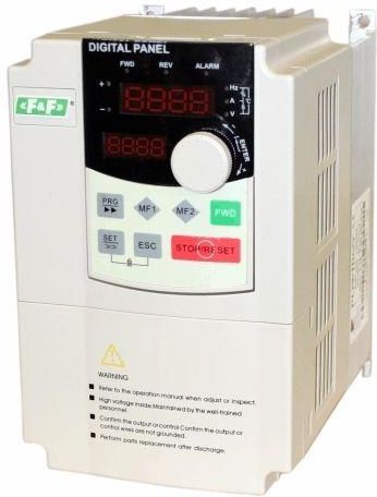 Falownik jednofazowy 1,5kW - FA-1LO15 Napięcie wejściowe: 1 x 230V. Prąd wejściowy: 17,5A. Napięcie wyjściowe: 3 x 230V. Prąd wyjściowy: 7A. Moc max. silnika: 1,5kW. Falowniki należą do grupy elektronicznych przekształtników częstotliwości i przeznaczone są do płynnej regulacji prędkości obrotowej asynchronicznych silników trójfazowych. Najistotniejsze funkcje Konstrukcja falownika oparta o wydajny 32-bitowy procesor DSP zapewnia szybką i efektywną realizację zaawansowanych algorytmów sterowania asynchronicznym silnikiem trójfazowym Możliwość pracy w trybie sterowania prędkością lub w trybie kontroli momentu napędowego Sterowanie silnikiem oparte o sterowanie wektorowe (zarówno bezczujnikowe jak i z pętlą prędkościowego sprzężenia zwrotnego), oraz sterowanie w oparciu o swobodnie programowane charakterystyki V/F. Funkcja automatycznej kompensacji poślizgu, oraz duży początkowy moment napędowy (nawet do 180% przy częstotliwości 0.25Hz). Wielofunkcyjny panel sterowniczy podłączany do falownika na zasadzie „hot-plug” z możliwością jednoczesnego przechowywania do czterech kompletów nastaw parametrów i funkcją łatwego przenoszenia nastaw z jednego falownika do drugiego Tryb PLC – możliwość zaprogramowania do siedmiu kroków realizowanych jednorazowo lub cyklicznie przez falownik. Dla każdego z kroków można określić prędkość, czas przyspieszania oraz czas trwania. Duża swoboda programowania wejść i wyjść falownika, zarówno analogowych jak i cyfrowych. Wbudowany moduł komunikacyjny RS485 wspierający protokół Modbus RTU umożliwia wpięcie falownika do sieci przemysłowych i zdalne sterowanie, nadzór i konfigurację pracy falownika.