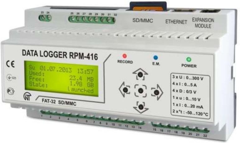Rejestrator RPM-416 jest mikroprocesorowym urządzeniem przeznaczonym do pomiaru wartości parametrów elektrycznych, wyświetlania tych wartości na wyświetlaczu oraz archiwizacji danych. Dane są archiwizowane na wymienną kartę pamięci (SD / MMC), później jest możliwa ich analiza za pomocą oprogramowania RPM-416 Data Analysis. Rejestrator RPM-416 ma wbudowany zegar czasu rzeczywistego zasilany z wbudowanej baterii litowej. W RPM-416 przewidziane jest podłączenie do sieci Ethernet w oparciu o standard 10Base-T lub 100Base-T. W tym przypadku równocześnie z zapisem danych na kartę pamięci możliwa jest konfiguracja RPM-416 i transmisja danych na komputer. Podstawowe możliwości rejestratora: Wielokanałowość – wystarczy jeden rejestrator, aby otrzymać pełne informacje o pracy monitorowanego obiektu; Uniwersalność – w rejestratorze przewidziano podłączenie dodatkowych modułów pozwalających rozszerzyć spektrum sygnałów wejściowych (napięcie, prąd, temperatura, wejścia dyskretne i inne); Separacja galwaniczna – sygnały wejściowe wysokiego napięcia i prądu są odseparowane galwanicznie od pozostałych wejść, co zapewnia prostotę podłączenia rejestratora; Wysoka niezawodność – system samokontroli i algorytm zapisu danych nie dopuszczają utraty danych w przypadku występowania sytuacji awaryjnych (np. braku zasilania); Wygodna konfiguracja – czteroliniowy znakowy wyświetlacz z podświetleniem pozwala skonfigurować rejestrator i monitorować przebieg jego pracy (na wyświetlaczu są wyświetlane wartości zapisywanych sygnałów wejściowych), klawiatura służy do konfiguracji i sterowania rejestratorem; Zdalny monitoring i konfiguracja – rejestrator, który jest zainstalowany w ciężko dostępnym miejscu i jest podłączony do Ethernet, równolegle z zapisem na kartę pamięci może dokonać transmisji danych na komputer. To pozwala zdalnie monitorować stan obiektu. Bardziej szczegółowa analiza jest dokonywana na podstawie danych zapisanych na karcie pamięci. Interfejs www pozwala zdalnie za pomocą przeglądarki komputera wykonać konfigurację rejestratora bez konieczności instalowania jakichkolwiek dodatkowych programów. Wersja RPM -416 Data Analysis powinna być zgodna z wersją oprogramowania rejestratora. Oprogramowania dla rejestratora: EN-V11, EN-V12, EN-V14, EN-V15, EN-V16, EN-V17, Instrukcja oprogramowania: download RPM-416 Data Analysis: download Instrukcja podłączenia do Overvis download