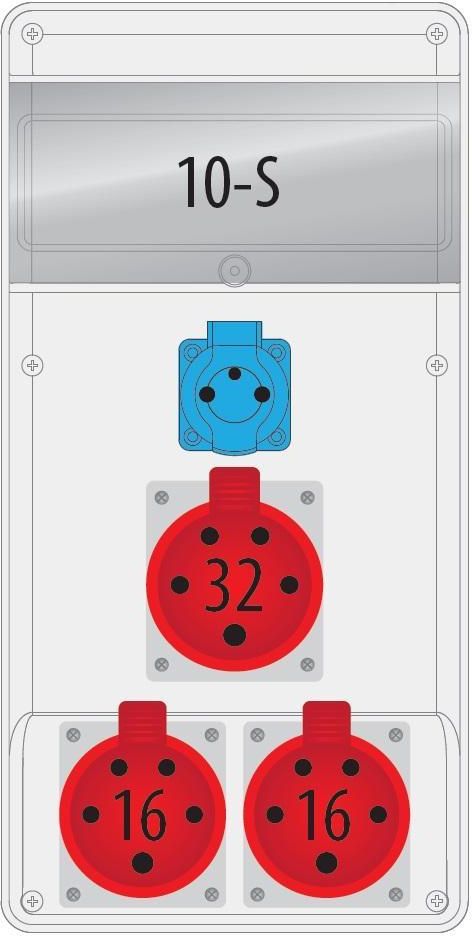 Gniazda: 2x16A/5p, 1x32A/5p, 1x250V, 10-S Tworzywo: PS/ABS Ochrona: IP44 Dławiki: PG21 Wymiary: 210 x 418 x max 160 mm